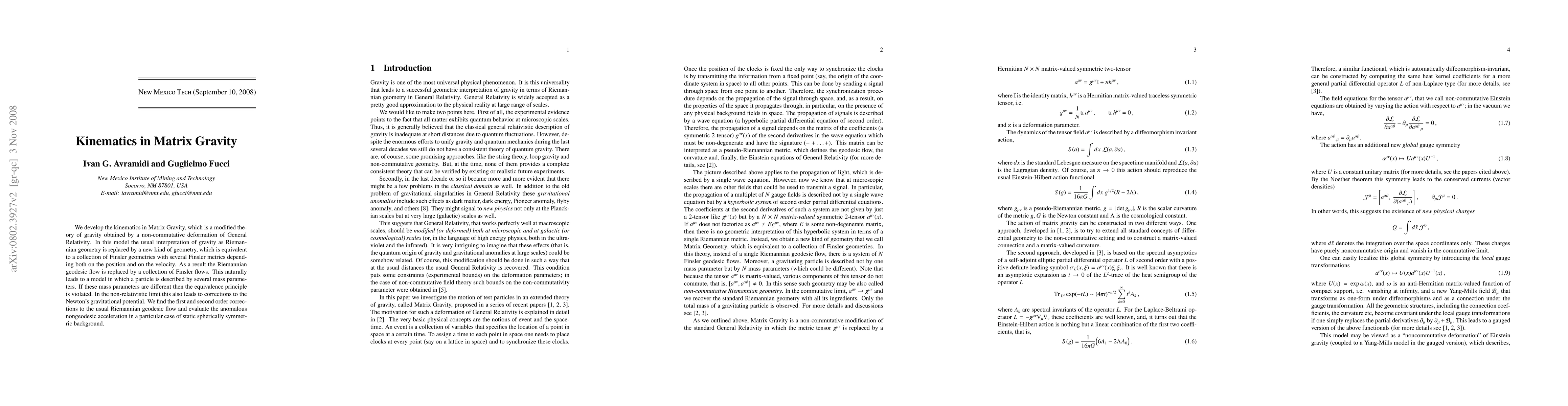 We develop the kinematics in Matrix Gravity, which is a modified theory of gravity obtained by a non-commutative deformation of General Relativity. In this model the usual interpretation of gravity as Riemannian geometry is replaced by a new kind of geometry, which is equivalent to a collection of Finsler geometries with several Finsler metrics depending both on the position and on the velocity. As a result the Riemannian geodesic flow is replaced by a collection of Finsler flows. This naturally leads to a model in which a particle is described by several mass parameters. If these mass parameters are different then the equivalence principle is violated. In the non-relativistic limit this also leads to corrections to the Newton's gravitational potential. We find the first and second order corrections to the usual Riemannian geodesic flow and evaluate the anomalous nongeodesic acceleration in a particular case of static spherically symmetric background.