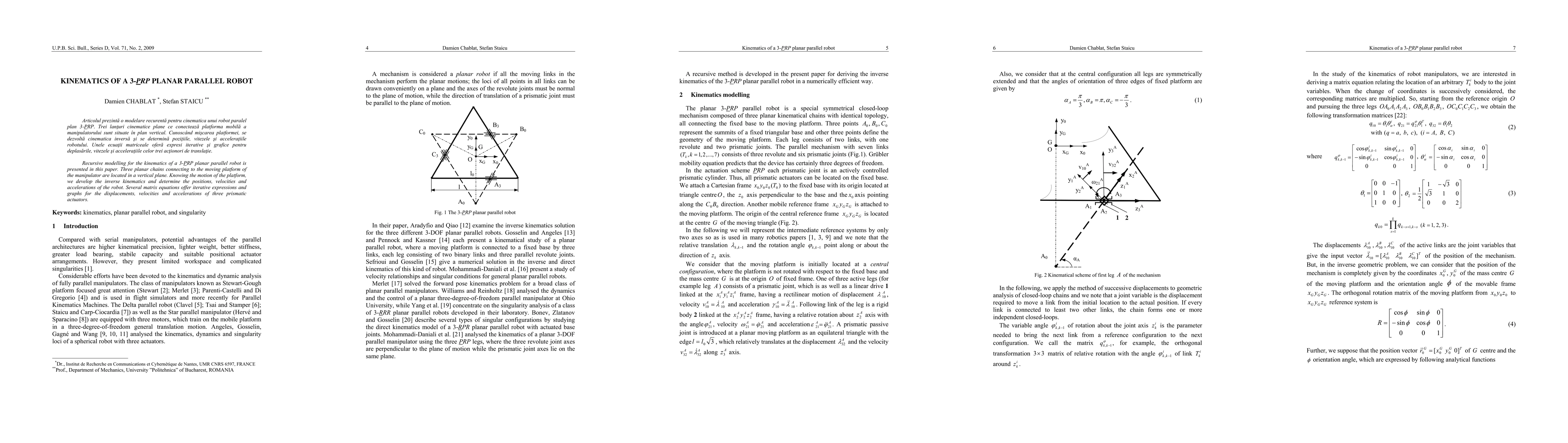 This paper presents a recursive model for the kinematics of a 3-PRP planar parallel robot, detailing the inverse kinematics to determine the positions, velocities, and accelerations of the robot's three prismatic actuators using matrix equations and iterative expressions.