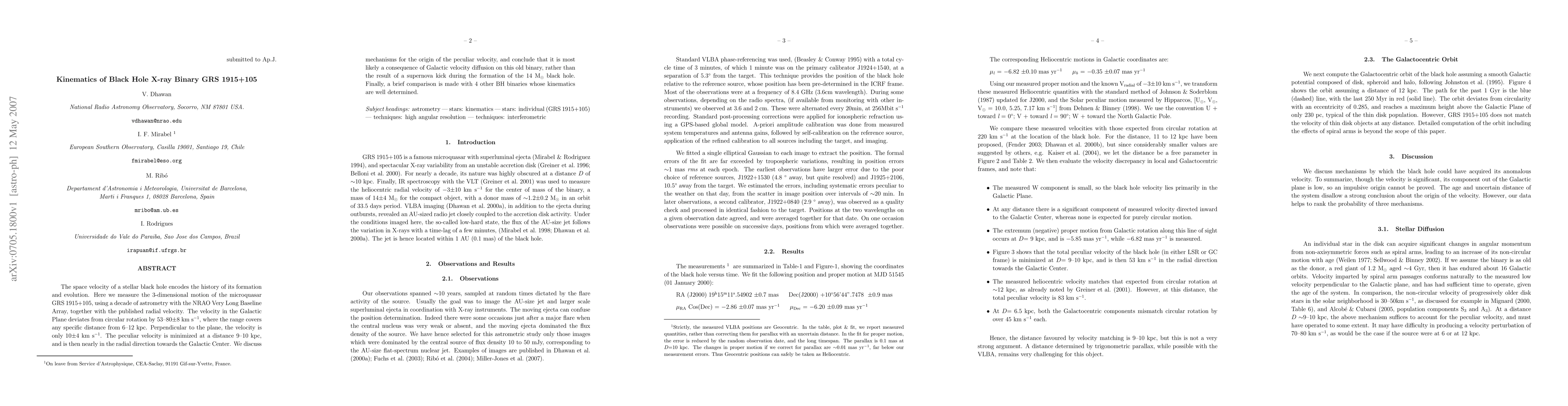The space velocity of a stellar black hole encodes the history of its formation and evolution. Here we measure the 3-dimensional motion of the microquasar GRS 1915+105, using a decade of astrometry with the NRAO Very Long Baseline Array, together with the published radial velocity. The velocity in the Galactic Plane deviates from circular rotation by 53-80 +_ 8 km/s, where the range covers any specific distance from 6-12 kpc. Perpendicular to the plane, the velocity is only 10 +_ 4 km/s. The peculiar velocity is minimized at a distance 9-10 kpc, and is then nearly in the radial direction towards the Galactic Center. We discuss mechanisms for the origin of the peculiar velocity, and conclude that it is most likely a consequence of Galactic velocity diffusion on this old binary, rather than the result of a supernova kick during the formation of the 14 Mo black hole. Finally, a brief comparison is made with 4 other BH binaries whose kinematics are well determined.