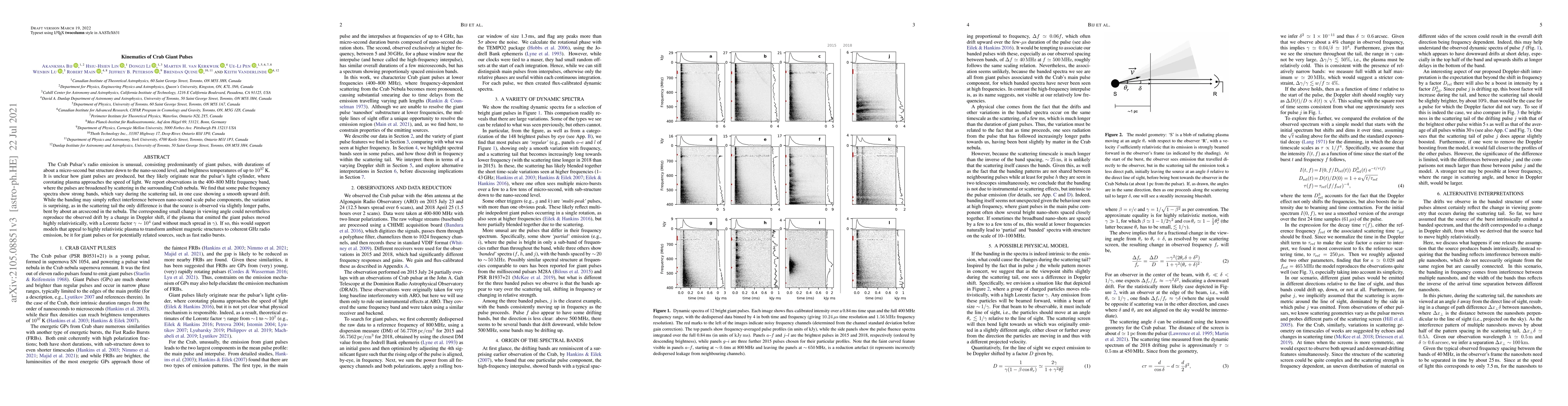 This paper investigates the kinematics of Crab Pulsar's giant pulses, finding that their frequency spectra exhibit strong bands that vary during scattering in the Crab nebula. The observed drift suggests that the emitting plasma may move relativistically with a Lorentz factor of around $10^4$, supporting models that involve highly relativistic plasma in generating coherent radio emissions.
