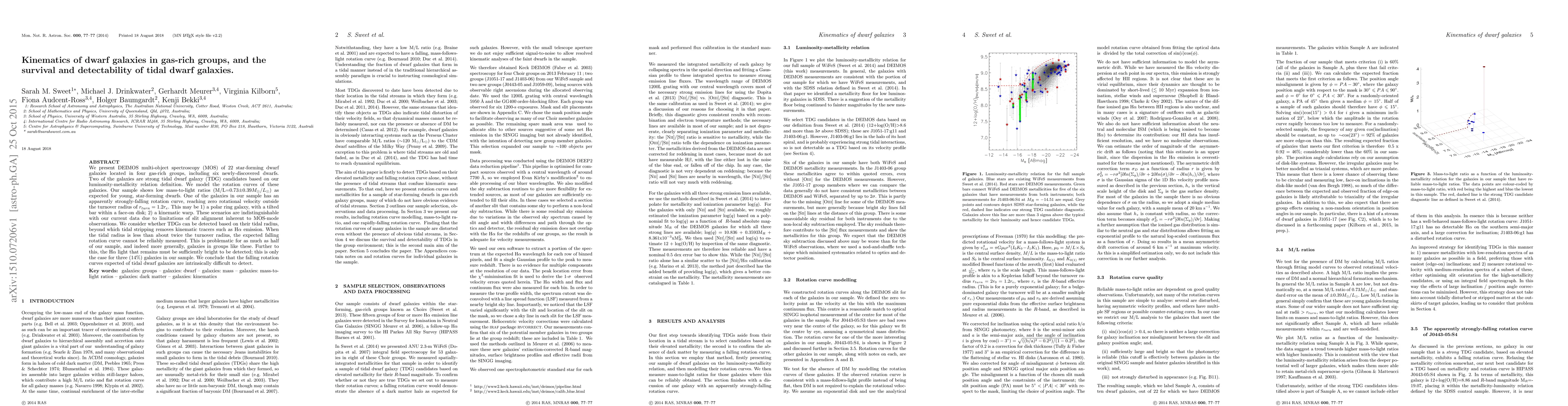 This study uses DEIMOS MOS to analyze the kinematics of 22 star-forming dwarf galaxies in gas-rich groups, finding low mass-to-light ratios typical of young dwarfs. It highlights the challenges in detecting tidal dwarf galaxies due to limitations in measuring falling rotation curves and the faintness of H$\alpha$ emission beyond their tidal radii.