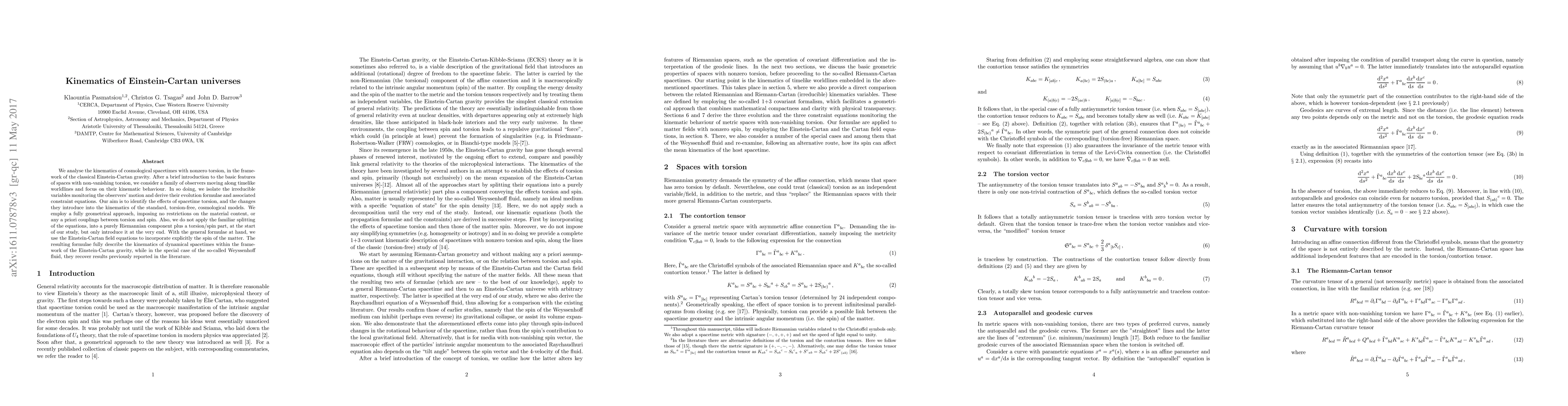 This research paper explores how spacetime torsion affects cosmological models, deriving new kinematic behaviour for observers in Einstein-Cartan gravity. It provides a fully geometrical approach to understanding the dynamics of spacetimes with nonzero torsion.