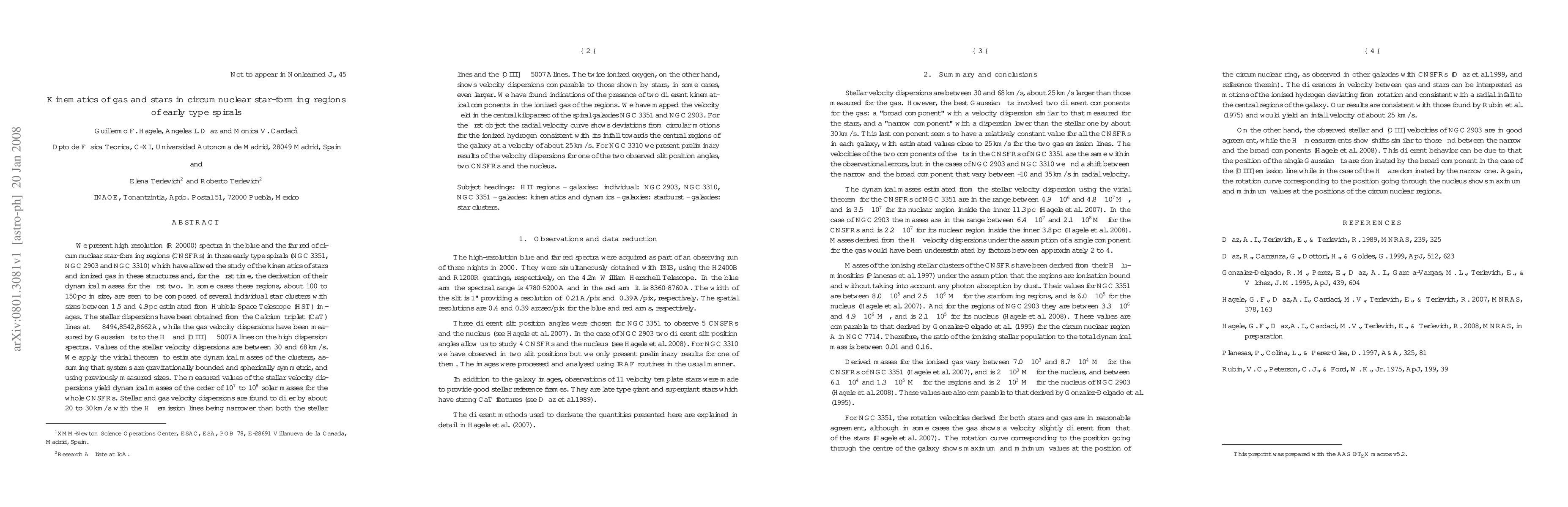(Abbr.) We present high resolution (R~20000) spectra in the blue and the far red of cicumnuclear star-forming regions (CNSFRs) in three early type spirals (NGC3351, NGC2903 and NGC3310) which have allowed the study of the kinematics of stars and ionized gas in these structures and, for the first time, the derivation of their dynamical masses for the first two. In some cases these regions, about 100 to 150 pc in size, are seen to be composed of several individual star clusters with sizes between 1.5 and 4.9 pc estimated from Hubble Space Telescope (HST) images. The stellar dispersions have been obtained from the Calcium triplet (CaT) lines at $\lambda\lambda$ 8494,8542,8662 \AA, while the gas velocity dispersions have been measured by Gaussian fits to the H$\beta$ and [OIII] $\lambda\lambda$ 5007 \AA lines on the high dispersion spectra. Values of the stellar velocity dispersions are between 30 and 68 km/s. We apply the virial theorem to estimate dynamical masses of the clusters, assuming that systems are gravitationally bounded and spherically symmetric, and using previously measured sizes. The measured values of the stellar velocity dispersions yield dynamical masses of the order of 10$^7$ to 10$^8$ solar masses for the whole CNSFRs. Stellar and gas velocity dispersions are found to differ by about 20 to 30 km/s with the H$\beta$ emission lines being narrower than both the stellar lines and the [OIII] $\lambda\lambda$ 5007 \AA lines. The twice ionized oxygen, on the other hand, shows velocity dispersions comparable to those shown by stars, in some cases, even larger. We have found indications of the presence of two different kinematical components in the ionized gas of the regions...