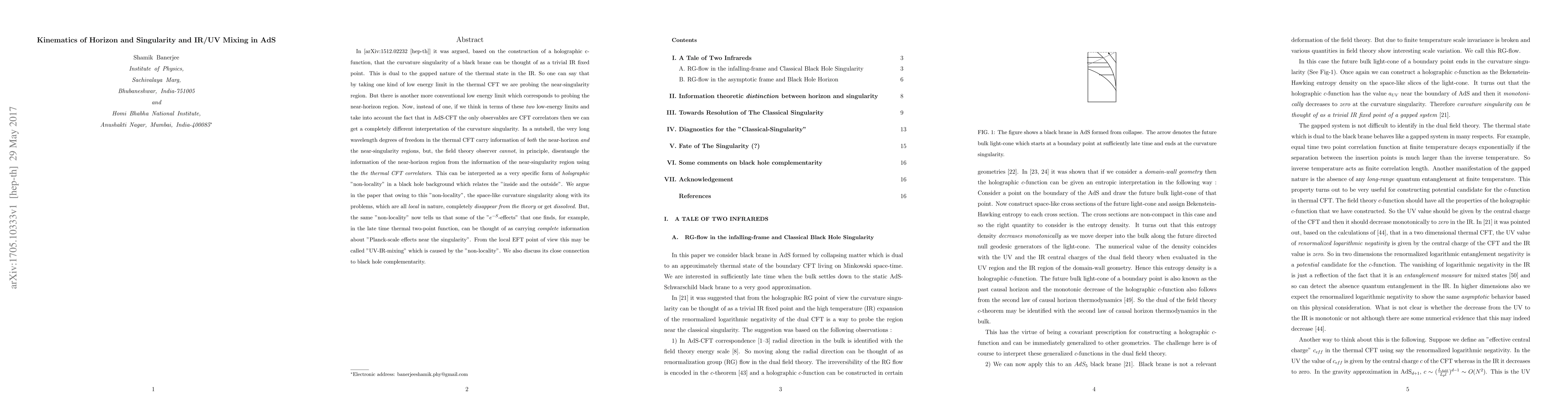 In [arXiv:1512.02232 [hep-th]] it was argued, based on the construction of a holographic c-function, that the curvature singularity of a black brane can be thought of as a trivial IR fixed point. This is dual to the gapped nature of the thermal state in the IR. So one can say that by taking one kind of low energy limit in the thermal CFT we are probing the near-singularity region. But there is another more conventional low energy limit which corresponds to probing the near-horizon region. Now, instead of one, if we think in terms of these two low-energy limits and take into account the fact that in AdS-CFT the only observables are CFT correlators then we can get a completely different interpretation of the curvature singularity. In a nutshell, the very long wavelength degrees of freedom in the thermal CFT carry information of both the near-horizon and the near-singularity regions, but, the field theory observer cannot, in principle, disentangle the information of the near-horizon region from the information of the near-singularity region using the the thermal CFT correlators. This can be interpreted as a very specific form of holographic "non-locality" in a black hole background which relates the "inside and the outside". We argue in the paper that owing to this "non-locality", the space-like curvature singularity along with its problems, which are all local in nature, completely disappear from the theory or get dissolved. But, the same "non-locality" now tells us that some of the "$e^{-S}$-effects" that one finds, for example, in the late time thermal two-point function, can be thought of as carrying complete information about "Planck-scale effects near the singularity". From the local EFT point of view this may be called "UV-IR-mixing" which is caused by the "non-locality". We also comment on its close relation to black hole complementarity.