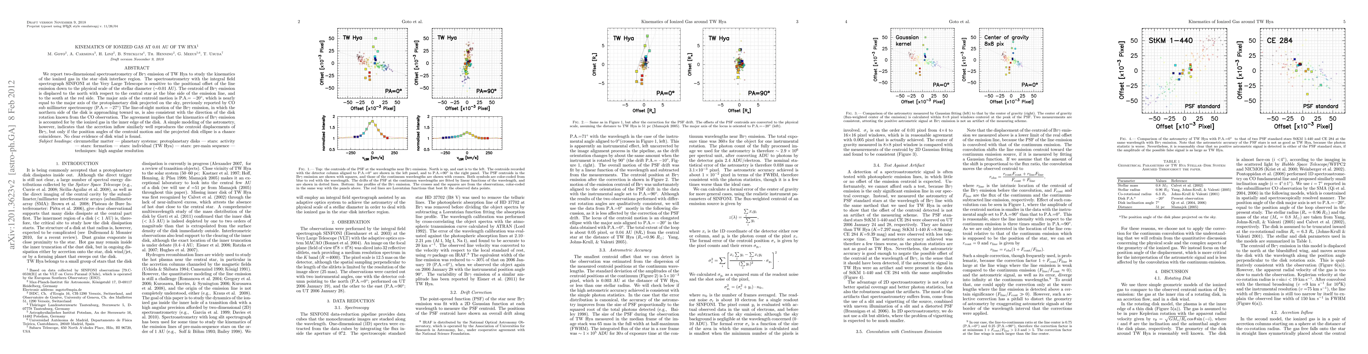 We report two-dimensional spectroastrometry of Br gamma emission of TW Hya to study the kinematics of the ionized gas in the star-disk interface region. The spectroastrometry with the integral field spectrograph SINFONI at the Very Large Telescope is sensitive to the positional offset of the line emission down to the physical scale of the stellar diameter (~0.01 AU). The centroid of Br gamma emission is displaced to the north with respect to the central star at the blue side of the emission line, and to the south at the red side. The major axis of the centroid motion is P.A.= -20 degrees, which is nearly equal to the major axis of the protoplanetary disk projected on the sky, previously reported by CO sub millimeter spectroscopy (P.A.= -27 degrees) The line-of-sight motion of the Br gamma emission, in which the northern side of the disk is approaching toward us, is also consistent with the direction of the disk rotation known from the CO observation. The agreement implies that the kinematics of Br gamma emission is accounted for by the ionized gas in the inner edge of the disk. A simple modeling of the astrometry, however, indicates that the accretion inflow similarly well reproduces the centroid displacements of Br gamma, but only if the position angles of the centroid motion and the projected disk ellipse is a chance coincidence. No clear evidence of disk wind is found.
