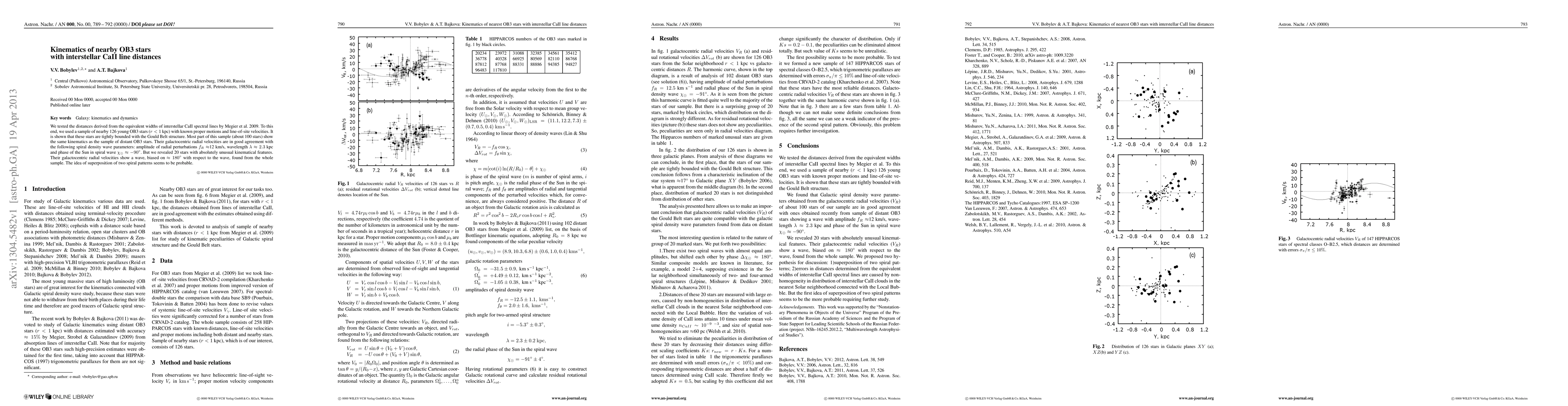 We tested the distances derived from the equivalent widths of interstellar CaII spectral lines by Megier et al. 2009. To this end, we used a sample of nearby 126 young OB3 stars ($r<1$ kpc) with known proper motions and line-of-site velocities. It is shown that these stars are tightly bounded with the Gould Belt structure. Most part of this sample (about 100 stars) show the same kinematics as the sample of distant OB3 stars. Their galactocentric radial velocities are in good agreement with the following spiral density wave parameters: amplitude of radial perturbations $f_R\approx$12 km/s, wavelength $\lambda\approx2.3$ kpc and phase of the Sun in spiral wave $\chi_\odot\approx-90^\circ$. But we revealed 20 stars with absolutely unusual kinematical features. Their galactocentric radial velocities show a wave, biased on $\approx180^\circ$ with respect to the wave, found from the whole sample. The idea of superposition of two spiral patterns seems to be probable.