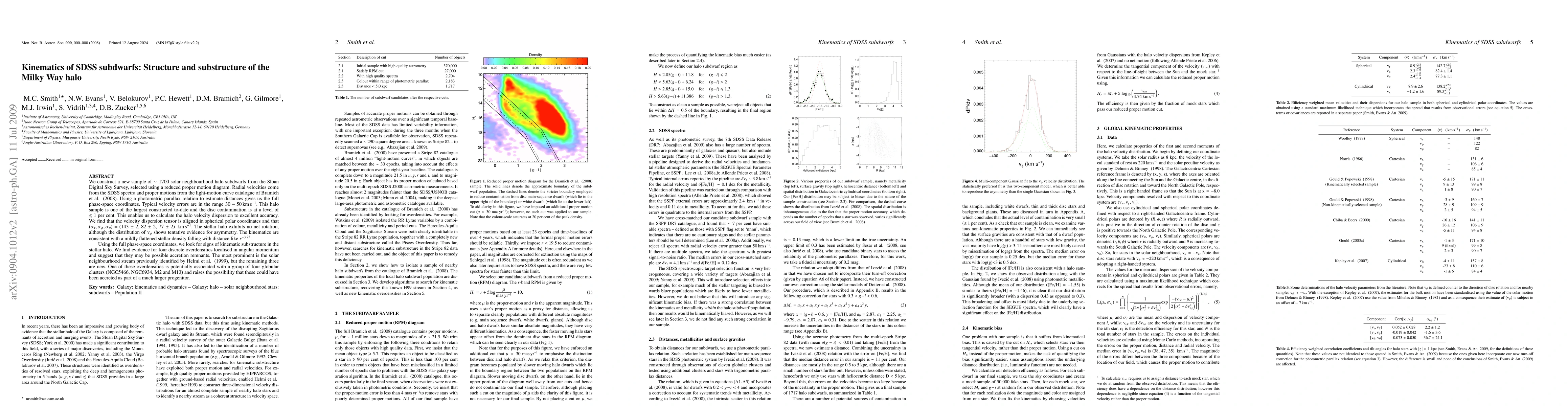 We construct a new sample of ~1700 solar neighbourhood halo subdwarfs from the Sloan Digital Sky Survey, selected using a reduced proper motion diagram. Radial velocities come from the SDSS spectra and proper motions from the light-motion curve catalogue of Bramich et al. (2008). Using a photometric parallax relation to estimate distances gives us the full phase-space coordinates. Typical velocity errors are in the range 30-50 km/s. This halo sample is one of the largest constructed to-date and the disc contamination is at a level of < 1 per cent. This enables us to calculate the halo velocity dispersion to excellent accuracy. We find that the velocity dispersion tensor is aligned in spherical polar coordinates and that (sigma_r, sigma_phi, sigma_theta) = (143 \pm 2, 82 \pm 2, 77 \pm 2) km/s. The stellar halo exhibits no net rotation, although the distribution of v_phi shows tentative evidence for asymmetry. The kinematics are consistent with a mildly flattened stellar density falling with distance like r^{-3.75}. Using the full phase-space coordinates, we look for signs of kinematic substructure in the stellar halo. We find evidence for four discrete overdensities localised in angular momentum and suggest that they may be possible accretion remnants. The most prominent is the solar neighbourhood stream previously identified by Helmi et al. (1999), but the remaining three are new. One of these overdensities is potentially associated with a group of four globular clusters (NGC5466, NGC6934, M2 and M13) and raises the possibility that these could have been accreted as part of a much larger progenitor.