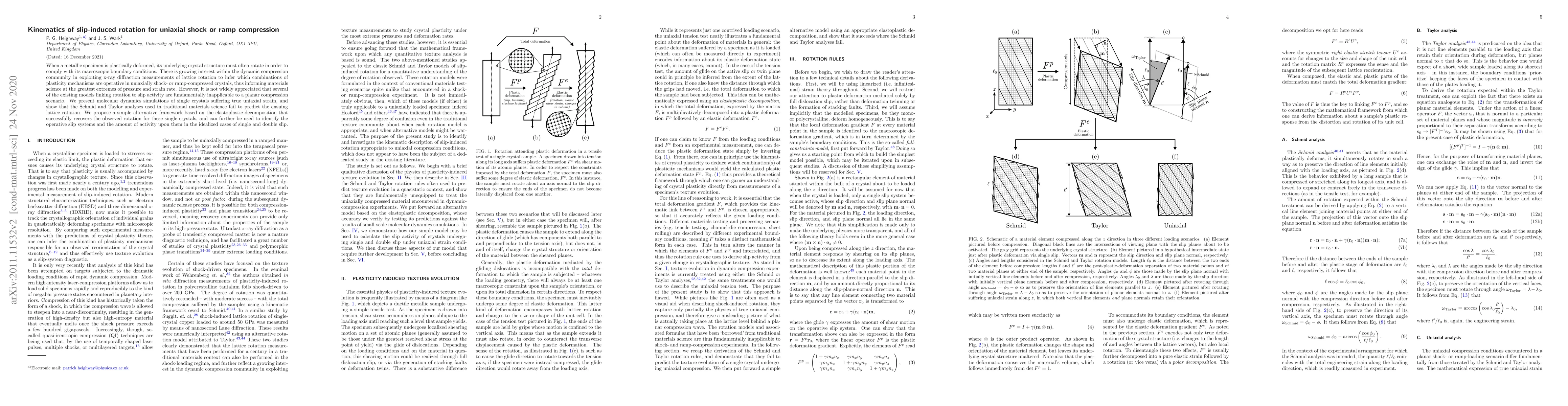 This paper investigates the kinematics of lattice rotation in uniaxial shock or ramp compression of metallic crystals, demonstrating that traditional models fail to predict observed rotations. It proposes a new elastoplastic decomposition framework that accurately captures the rotation and identifies active slip systems.
