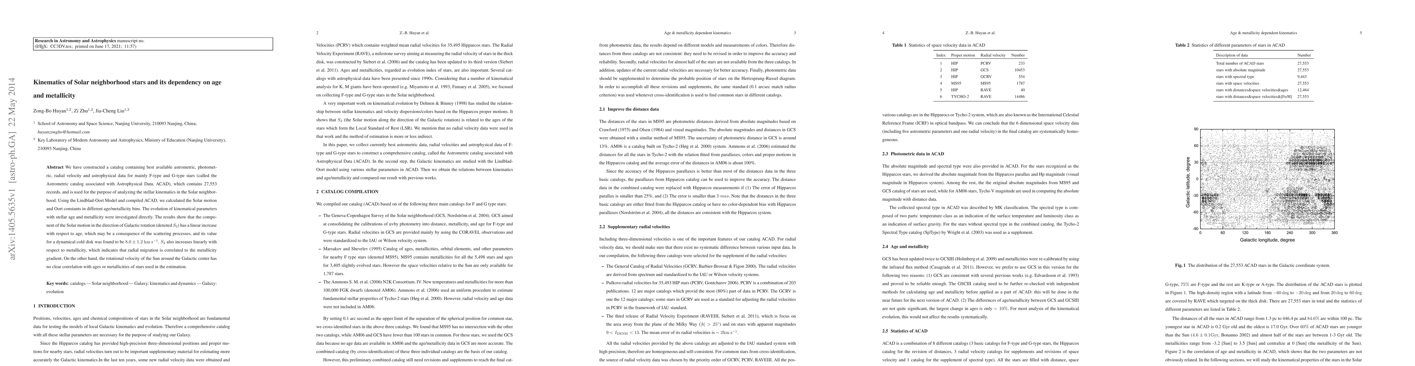 This paper analyzes stellar kinematics in the Solar neighborhood using the ACAD catalog, focusing on F-type and G-type stars. It finds that the Solar motion component $S_2$ increases linearly with both stellar age and metallicity, suggesting a correlation with radial migration and scattering processes.