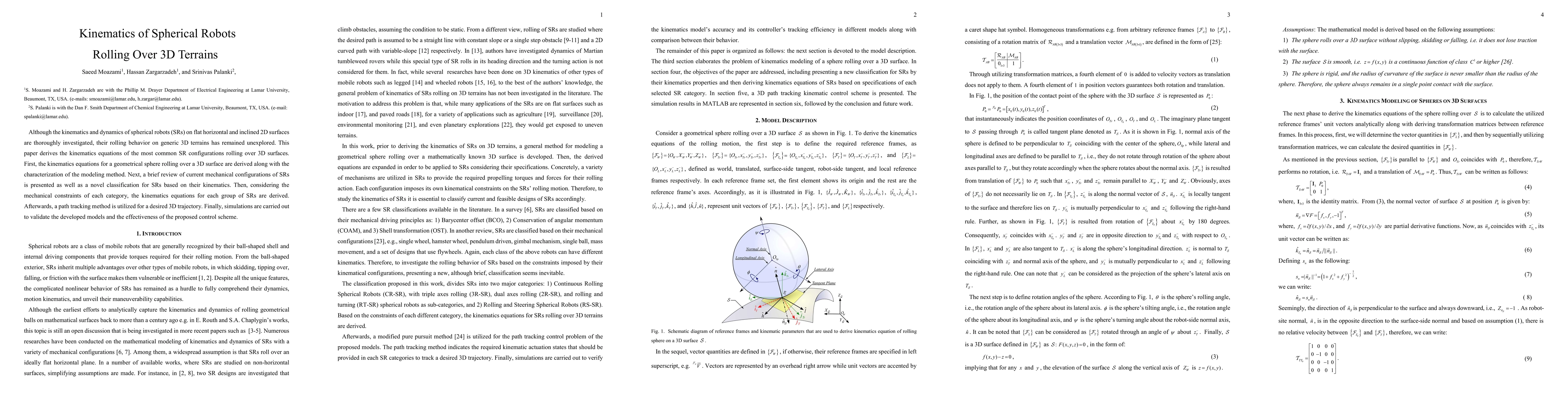 This paper derives kinematics equations for spherical robots (SRs) navigating 3D terrains, classifying SR configurations and presenting trajectory tracking methods, validated via simulations.