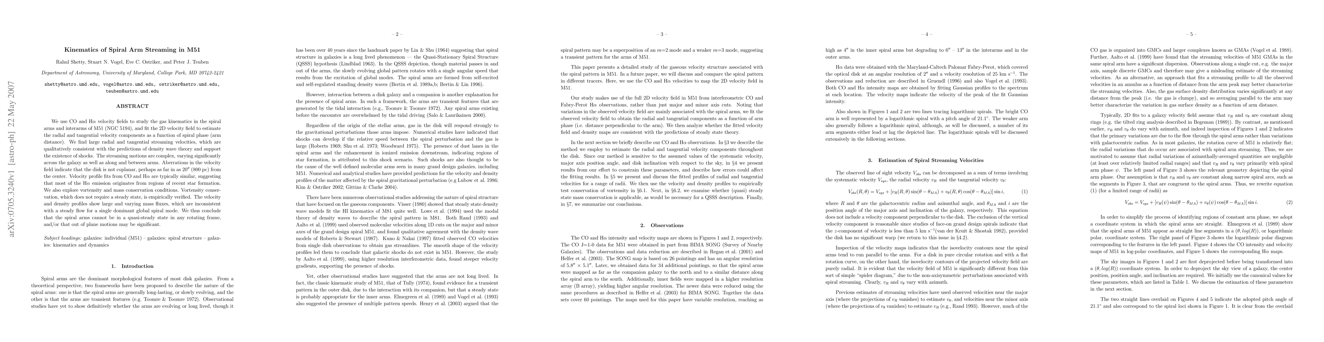 We use CO and H alpha velocity fields to study the gas kinematics in the spiral arms and interarms of M51 (NGC 5194), and fit the 2D velocity field to estimate the radial and tangential velocity components as a function of spiral phase (arm distance). We find large radial and tangential streaming velocities, which are qualitatively consistent with the predictions of density wave theory and support the existence of shocks. The streaming motions are complex, varying significantly across the galaxy as well as along and between arms. Aberrations in the velocity field indicate that the disk is not coplanar, perhaps as far in as 20\arcsec\ (800 pc) from the center. Velocity profile fits from CO and H alpha are typically similar, suggesting that most of the H alpha emission originates from regions of recent star formation. We also explore vortensity and mass conservation conditions. Vortensity conservation, which does not require a steady state, is empirically verified. The velocity and density profiles show large and varying mass fluxes, which are inconsistent with a steady flow for a single dominant global spiral mode. We thus conclude that the spiral arms cannot be in a quasi-steady state in any rotating frame, and/or that out of plane motions may be significant.