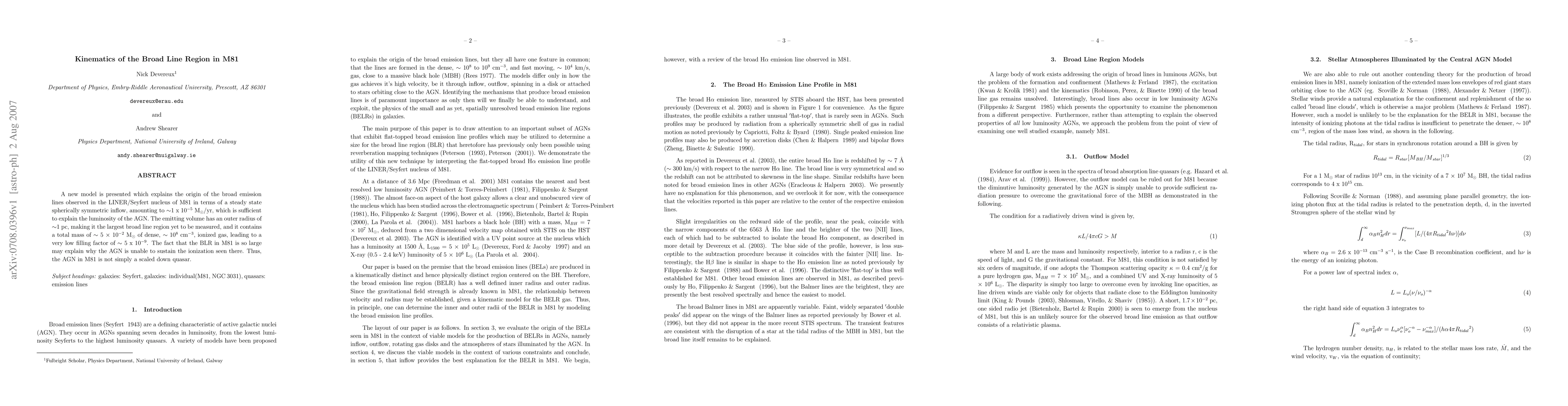 The paper proposes a model for the broad emission lines in M81's LINER/Seyfert nucleus, describing it as a steady, spherical inflow of 1 x 10^-5 Msun/yr ionized gas. This large broad line region (~1 pc in radius) contains ~5 x 10^-2 Msun of dense gas, indicating a very low filling factor. This unique BLR size might explain the AGN's limited ionization capacity, suggesting M81's AGN is distinct from scaled-down quasars.