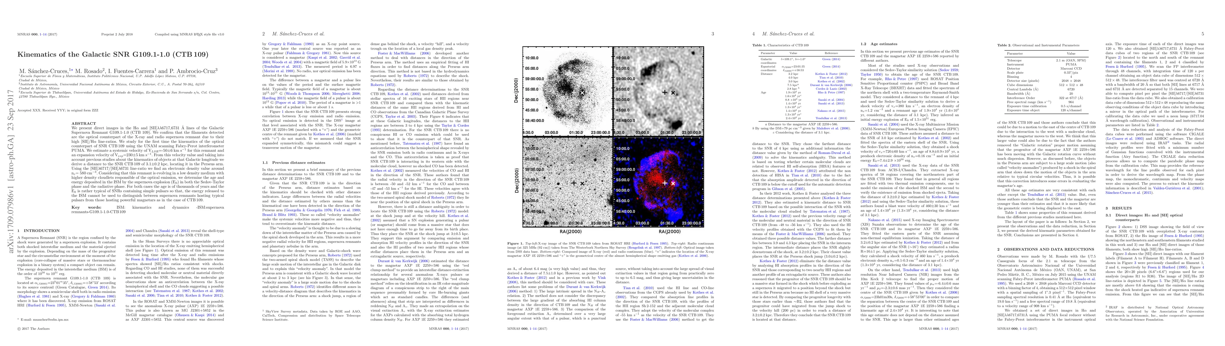 This paper presents the kinematics of the Galactic Supernova Remnant G109.1-1.0 (CTB 109) using H$\alpha$ and [SII] lines, estimating a systemic velocity of -50$\pm$6 km s$^{-1}$ and an expansion velocity of 230$\pm$5 km s$^{-1}$. The derived distance places it in the Perseus arm at 3.1$\pm$0.2 kpc.