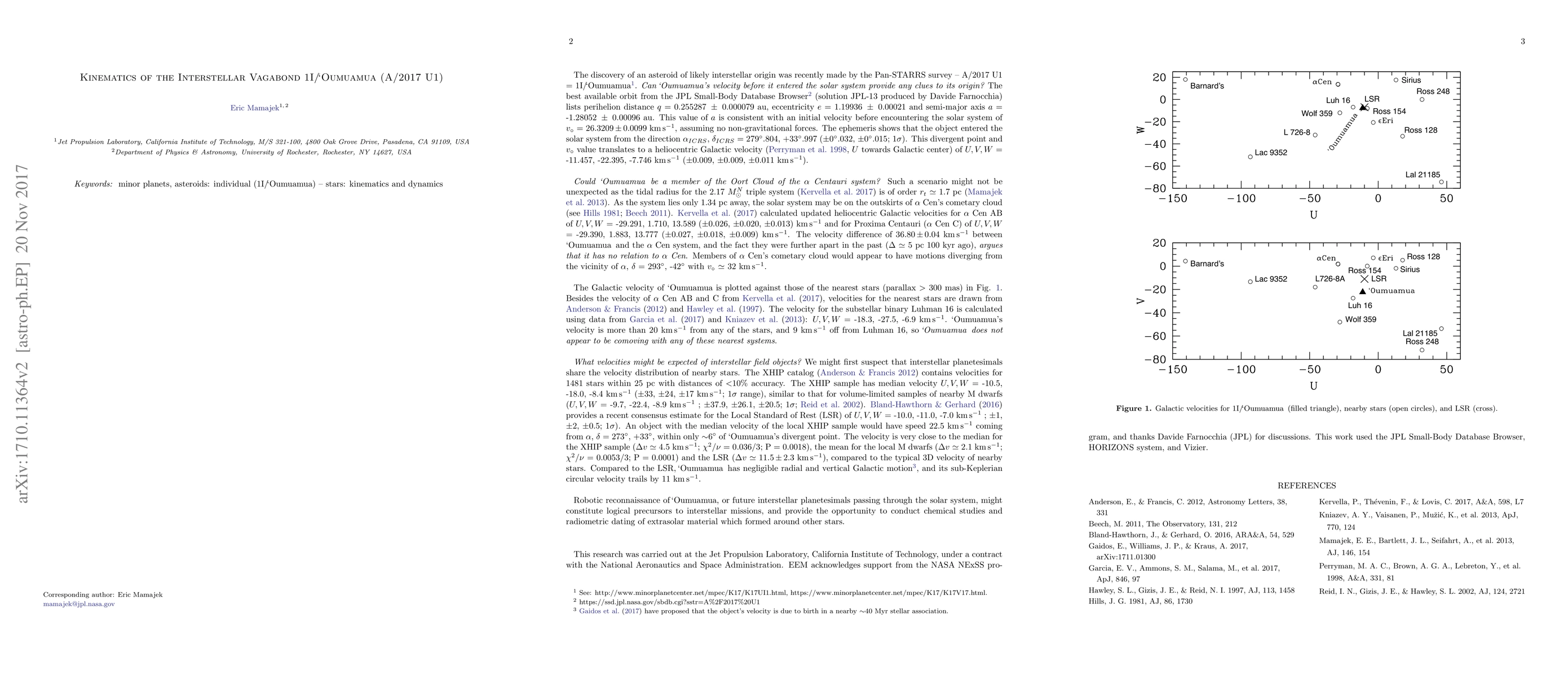 The initial Galactic velocity vector for the recently discovered hyperbolic asteroid 1I/'Oumuamua (A/2017 U1) is calculated for before its encounter with our solar system. The latest orbit (JPL-13) shows that 'Oumuamua has eccentricity > 1 at 944\sigma\, significance (1.19936 +- 0.00021), i.e. clearly unbound. Assuming no non-gravitational forces, the object's inbound Galactic velocity was U, V, W = -11.457, -22.395, -7.746 (+-0.009, +-0.009, +-0.011) km/s (U towards Galactic center), with total heliocentric speed 26.32 +- 0.01 km/s. When the velocity is compared to the local stars, 'Oumuamua can be ruled out as co-moving with any of the dozen nearest systems, i.e. it does not appear to be associated with any local exo-Oort clouds (most notably that of the Alpha Centauri triple system). 'Oumuamua's velocity is within 5 km/s of the median Galactic velocity of the stars in the solar neighborhood (<25 pc), and within 2 km/s of the mean velocity of the local M dwarfs. Its velocity appears to be statistically "too" typical for a body whose velocity was drawn from the Galactic velocity distribution of the local stars (i.e. less than 1 in 500 field stars in the solar neighborhood would have a velocity so close to the median UVW velocity). In the Local Standard of Rest frame (circular Galactic motion), 'Oumuamua is remarkable for showing both negligible radial (U) and vertical (W) motion, while having a slightly sub-Keplerian circular velocity (V; by ~11 km/s). These calculations strengthen the interpretation that A/2017 U1 has a distant extrasolar origin, but not among the very nearest stars. Any formation mechanism for this interstellar asteroid should account for the coincidence of 'Oumuamua's velocity being so close to the LSR.