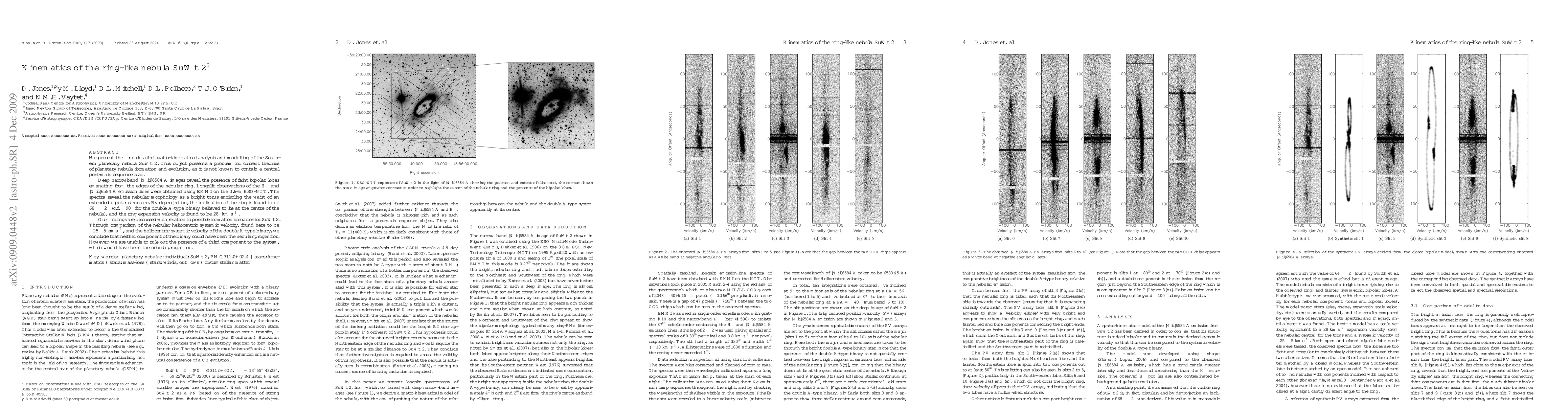 We present the first detailed spatio-kinematical analysis and modelling of the Southern planetary nebula SuWt 2. This object presents a problem for current theories of planetary nebula formation and evolution, as it is not known to contain a central post-main sequence star. Deep narrowband [NII]6584 images reveal the presence of faint bipolar lobes emanating fromthe edges of the nebular ring. Longslit observations of the H-alpha and [NII]6584 emission lines were obtained using EMMI on the 3.6-m ESO-NTT. The spectra reveal the nebular morphology as a bright torus encircling the waist of an extended bipolar structure. By deprojection, the inclination of the ring is found to be 68$\degr$ $\pm$ 2$\degr$ (c.f. ~90$\degr$ for the double A-type binary believed to lie at the centre of the nebula), and the ring expansion velocity is found to be 28 km/s. Our findings are discussed with relation to possible formation scenarios for SuWt 2. Through comparison of the nebular heliocentric systemic velocity, found here to be -25 $\pm$ 5 km/s, and the heliocentric systemic velocity of the double A-type binary, we conclude that neither component of the binary could have been the nebular progenitor. However, we are unable to rule out the presence of a third component to the system, which would have been the nebula progenitor.