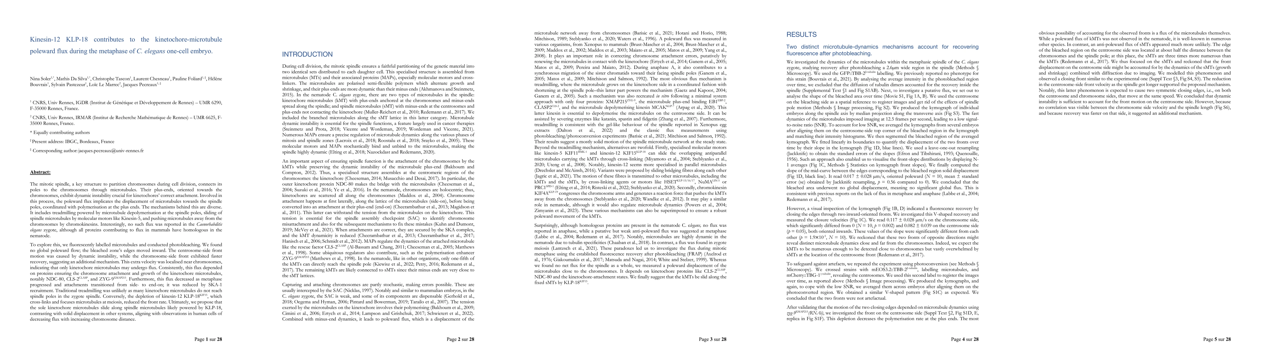 The mitotic spindle partitions chromosomes during cell division by connecting the poles to kinetochores through microtubules (MTs). Their plus-ends, facing the chromosomes, exhibit dynamic instability, which is critical for proper attachment. The poleward flux implicates the displacement of Mts towards the spindle poles, while plus-ends polymerise. It may result from minus-end depolymerisation (treadmilling), sliding by kinesins (e.g., Kinesin-5), or pushing by chromokinesins. Intriguingly, such flux had not been reported in the C. elegans zygote, despite homologs of flux-associated proteins being present. To investigate this, we fluorescently labelled Mts and used photobleaching. We observed no global flux; instead, the bleached zone's edges moved inward. The centrosome-facing front reflected MT dynamic instability, but the chromosome-facing front showed faster recovery, suggesting an additional mechanism. This extra velocity was spatially restricted to the vicinity of chromosomes, suggesting that only the kinetochore Mts may undergo flux. Supporting this, flux required key kinetochore regulators: NDC-80, $\text{CLS-2}^\text{CLASP}$, and $\text{ZYG-9}^\text{XMAP215}$. Flux declined as metaphase progressed, correlating with the attachment maturation from lateral to end-on, and was suppressed by SKA-1 recruitment. Classic treadmilling was unlikely, as most kinetochore MTs in C. $elegans$ do not reach spindle poles. Instead, depleting $\text{KLP-18}^\text{KIF15}$, a kinesin that cross-links and organises Mts during meiosis, reduced front movement. We propose that only kinetochore Mts undergo flux, sliding along the spindle Mts, likely powered by KLP-18. This localised sliding contrasts with global flux seen in other systems, and aligns with observations in human cells showing flux reduction as chromosome-to-pole distance increases.