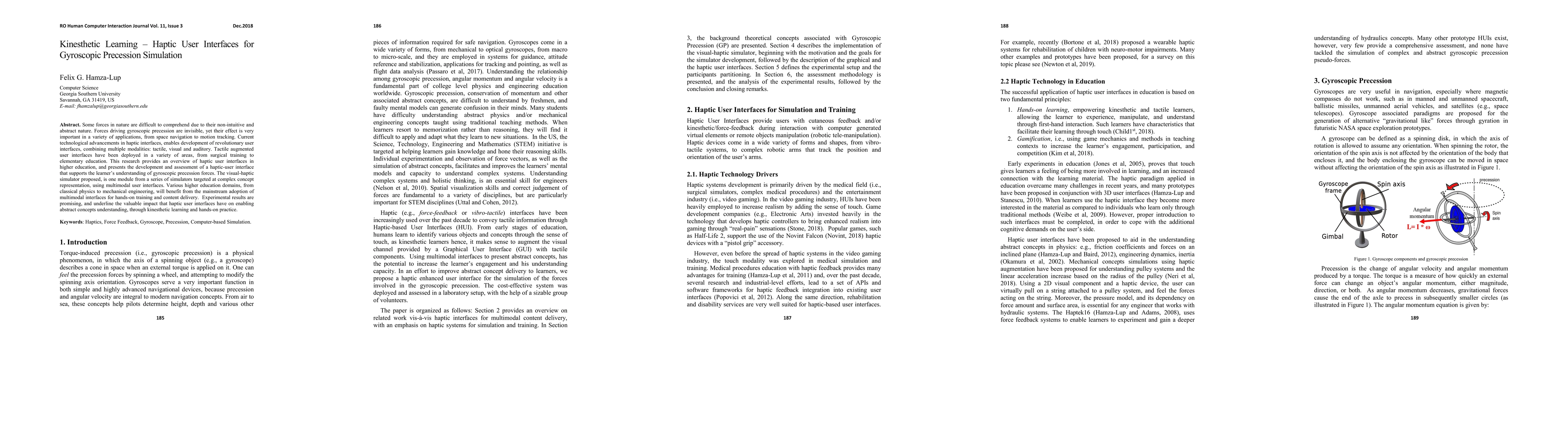 This research explores haptic user interfaces for teaching gyroscopic precession, demonstrating their potential to enhance understanding through kinesthetic learning. Experimental results show promising outcomes in higher education, suggesting that multi-modal interfaces can effectively convey complex concepts.