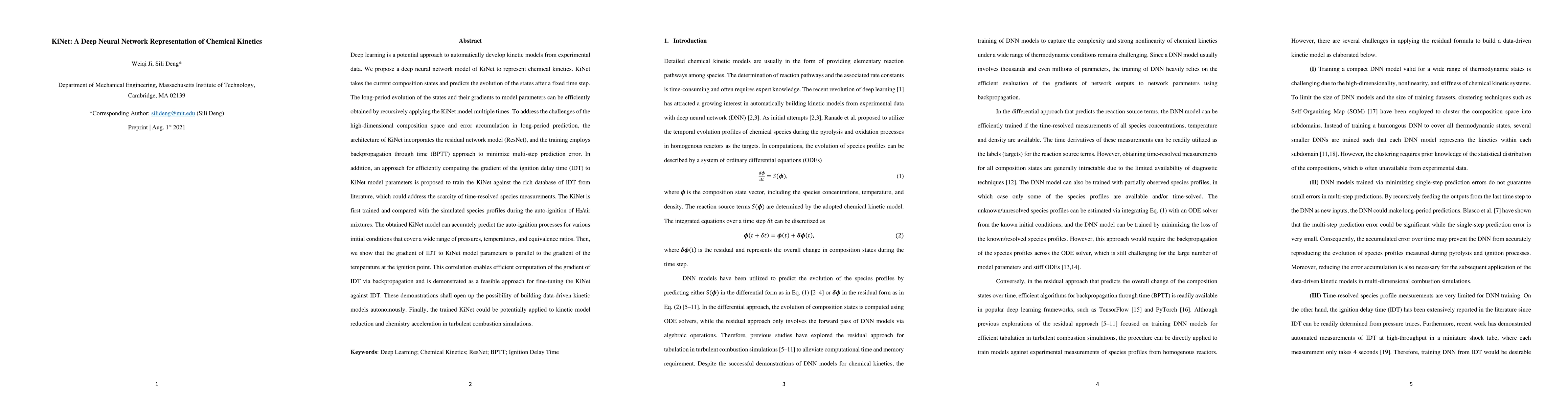 The paper proposes KiNet, a deep neural network model that uses residual networks and backpropagation through time to predict the evolution of chemical kinetics from experimental data. KiNet effectively addresses high-dimensional composition spaces and error accumulation over time, and it can be fine-tuned using gradients of ignition delay times, potentially enabling autonomous development of kinetic models for turbulent combustion simulations.