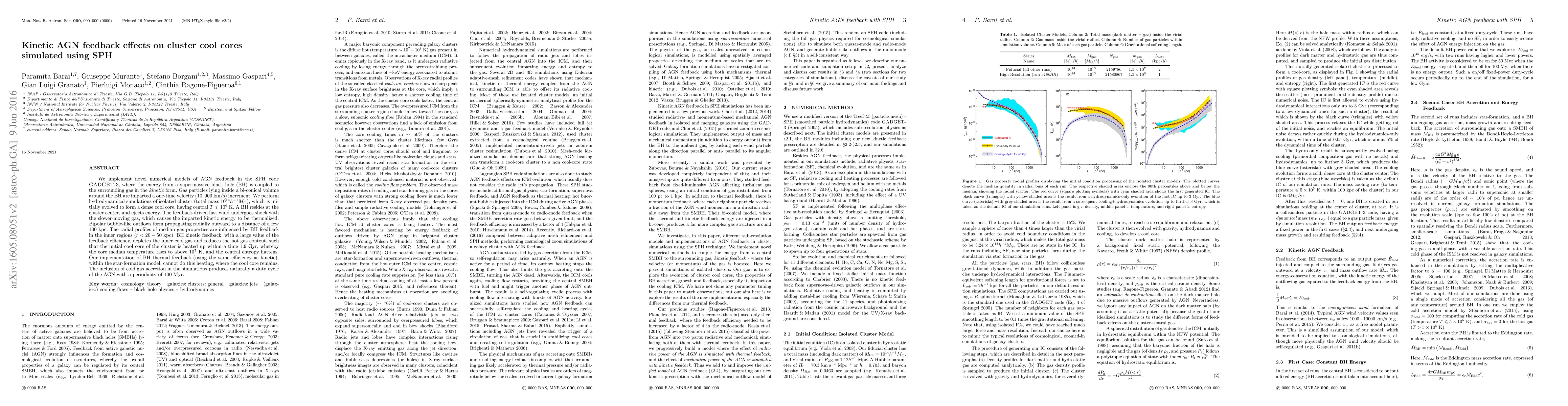 Research simulates AGN feedback in galaxy clusters using SPH, finding that kinetic energy from a supermassive black hole accelerates gas outward, reducing cool core temperature over 1.9 Gyr.