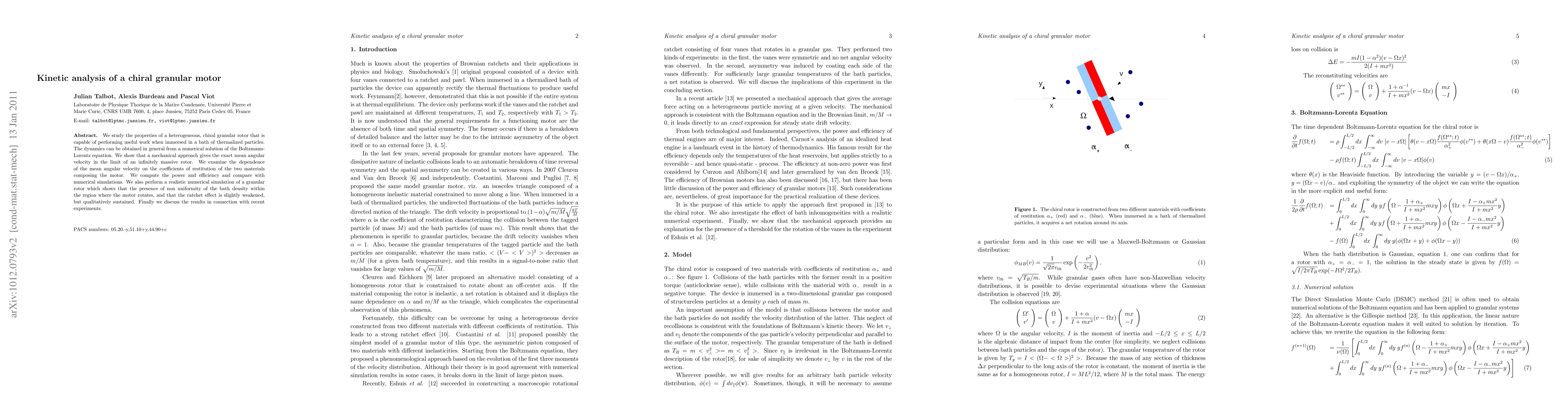 We study the properties of a heterogeneous, chiral granular rotor that is capable of performing useful work when immersed in a bath of thermalized particles. The dynamics can be obtained in general from a numerical solution of the Boltzmann-Lorentz equation. We show that a mechanical approach gives the exact mean angular velocity in the limit of an infinitely massive rotor. We examine the dependence of the mean angular velocity on the coefficients of restitution of the two materials composing the motor. We compute the power and efficiency and compare with numerical simulations. We also perform a realistic numerical simulation of a granular rotor which shows that the presence of non uniformity of the bath density within the region where the motor rotates, and that the ratchet effect is slightly weakened, but qualitatively sustained. Finally we discuss the results in connection with recent experiments.
