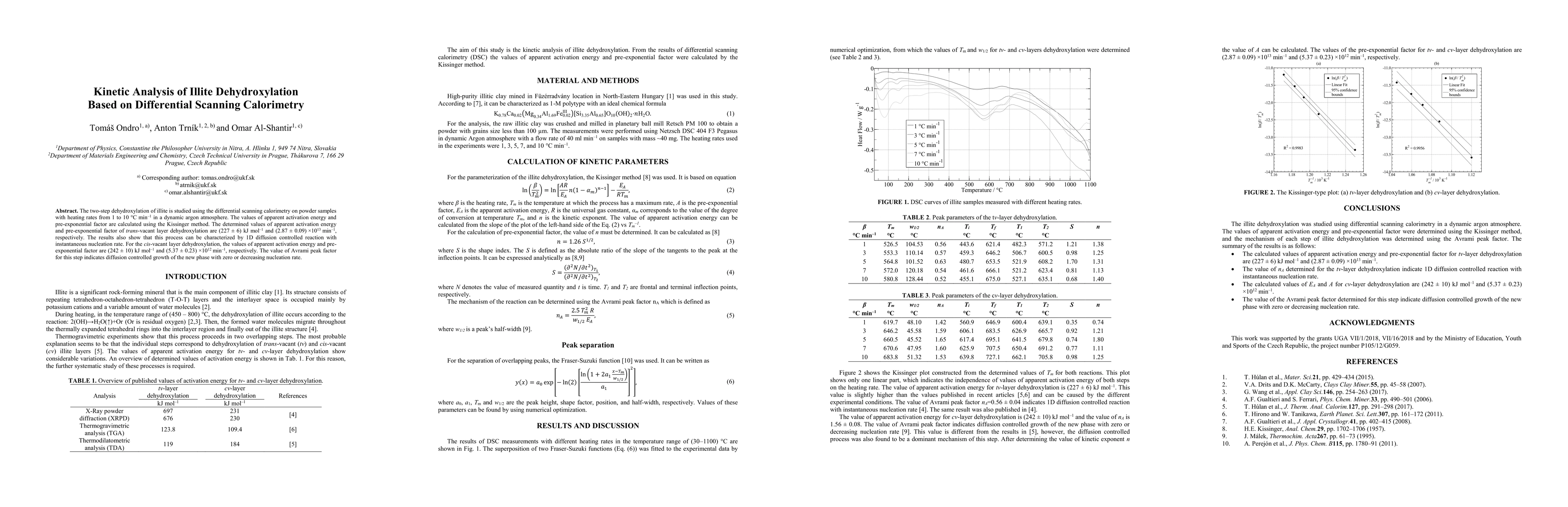 This study uses differential scanning calorimetry to analyze the two-step dehydroxylation of illite, determining activation energies and pre-exponential factors for both trans-vacant and cis-vacant layer dehydroxylation processes, and characterizing the reaction mechanisms.