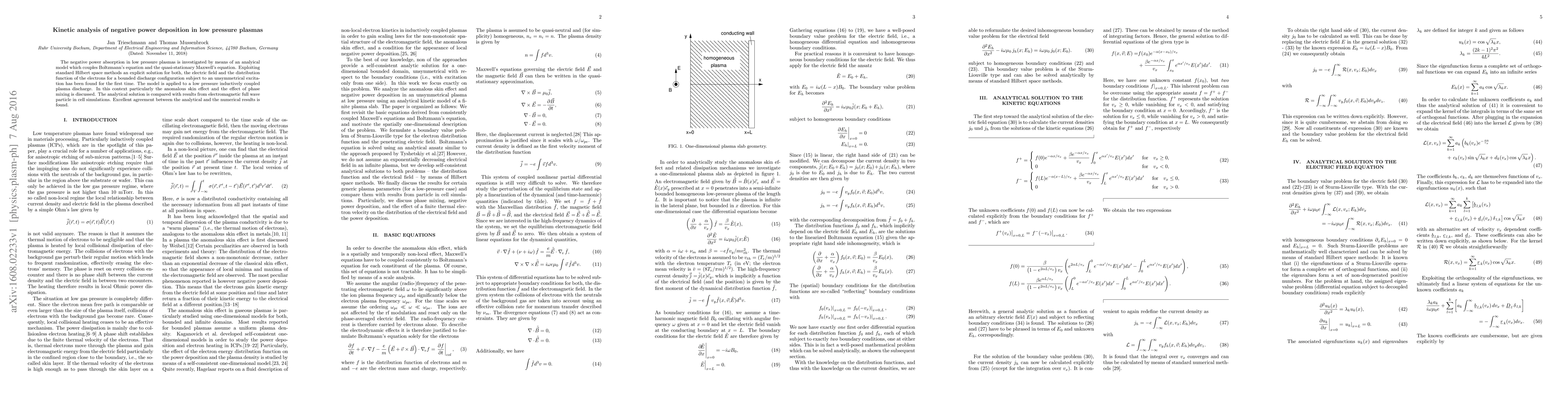The negative power absorption in low pressure plasmas is investigated by means of an analyical model which couples Boltzmann's equation and the quasi-stationary Maxwell's equation. Exploiting standard Hilbert space methods an explicit solution for both, the electric field and the distribution function of the electrons for a bounded discharge configuration subject to an unsymmetrical excitation has been found for the first time. The model is applied to a low pressure inductively coupled plasma discharge. In this context particularly the anomalous skin effect and the effect of phase mixing is discussed. The analytical solution is compared with results from electromagnetic full wave particle in cell simulations. Excellent agreement between the analytical and the numerical results is found.