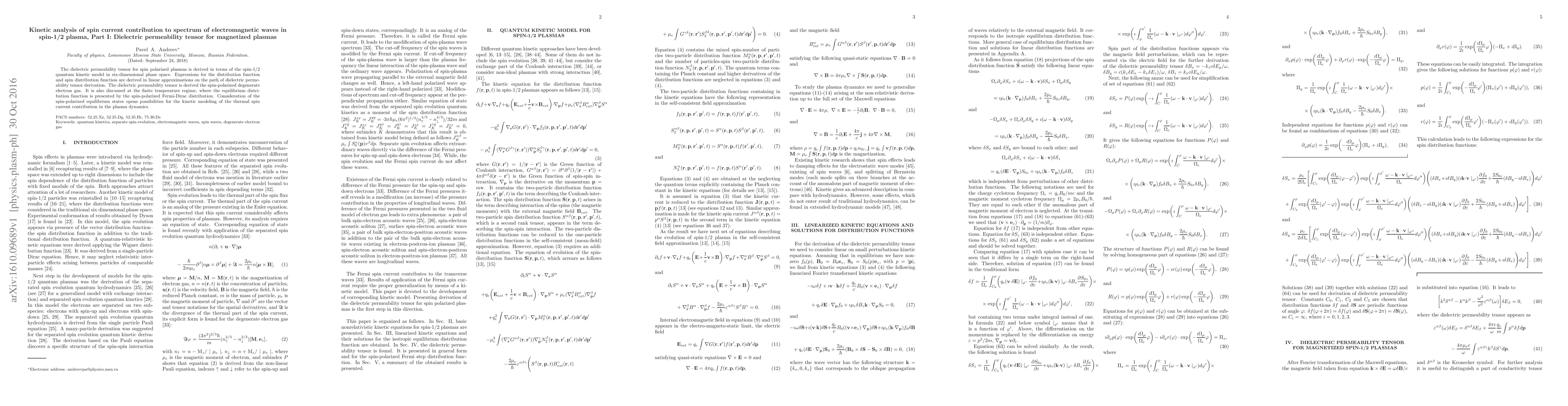 This paper derives the dielectric permeability tensor for spin-polarized plasmas using the spin-1/2 quantum kinetic model, focusing on the finite temperature regime and the spin-polarized degenerate electron gas. It also explores the implications for the kinetic modeling of thermal spin current contributions in plasma dynamics.