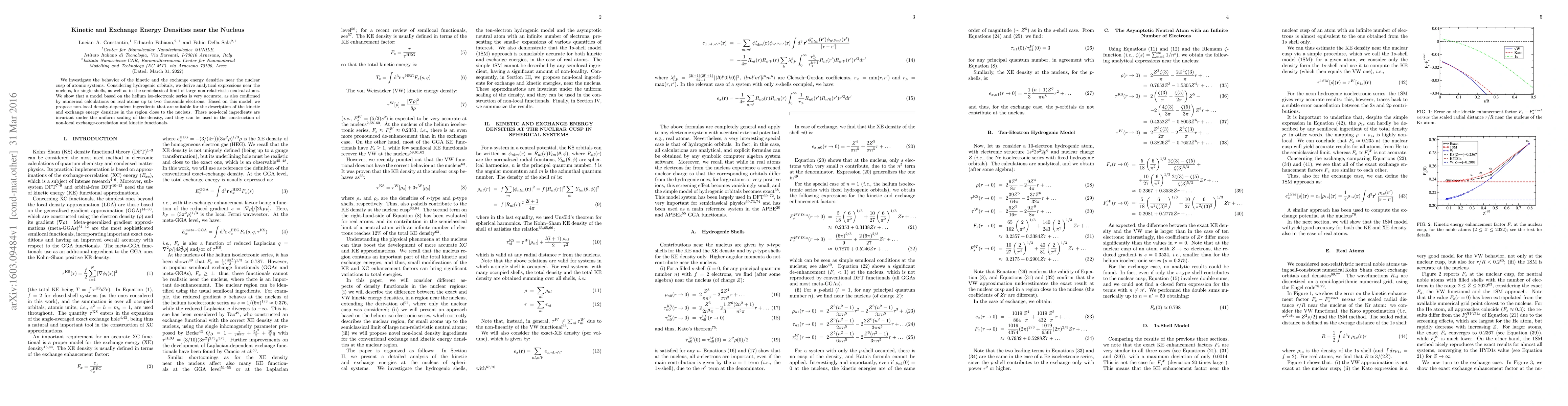 This paper investigates the kinetic and exchange energy densities near the nuclear cusp in atomic systems, deriving analytical expressions for hydrogenic orbitals and proposing non-local density-dependent ingredients for accurate description in this region. The model's accuracy is validated by numerical calculations on atoms with up to two thousand electrons.