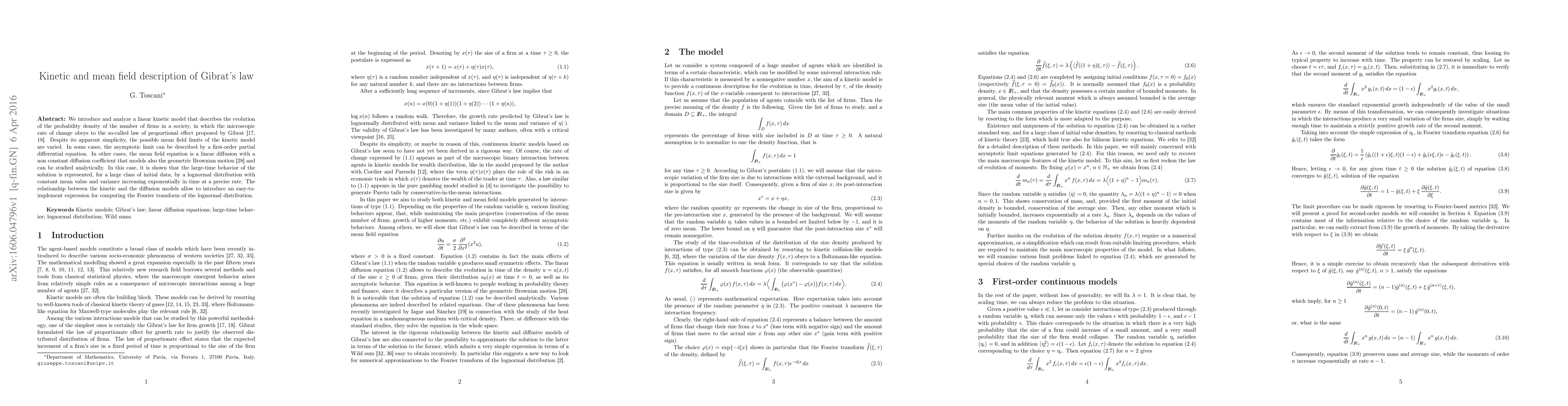 We introduce and analyze a linear kinetic model that describes the evolution of the probability density of the number of firms in a society, in which the microscopic rate of change obeys to the so-called law of proportional effect proposed by Gibrat. Despite its apparent simplicity, the possible mean field limits of the kinetic model are varied. In some cases, the asymptotic limit can be described by a first-order partial differential equation. In other cases, the mean field equation is a linear diffusion with a non constant diffusion coefficient that models also the geometric Brownian motion and can be studied analytically. In this case, it is shown that the large-time behavior of the solution is represented, for a large class of initial data, by a lognormal distribution with constant mean value and variance increasing exponentially in time at a precise rate. The relationship between the kinetic and the diffusion models allow to introduce an easy-to- implement expression for computing the Fourier transform of the lognormal distribution.