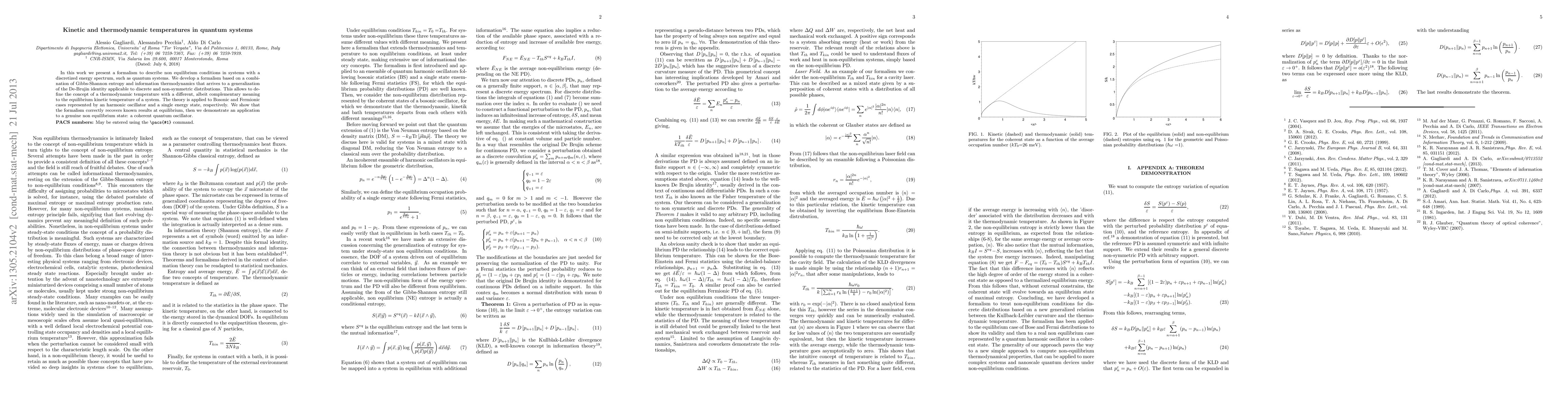 In this work we present a formalism to describe non equilibrium conditions in systems with a discretized energy spectrum, such as quantum systems. We develop a formalism based on a combination of Gibbs-Shannon entropy and information thermodynamics that arrives to a generalization of the De-Brujin identity applicable to discrete and non-symmetric distributions. This allows to define the concept of a thermodynamic temperature with a different, albeit complementary meaning to the equilibrium kinetic temperature of a system. The theory is applied to Bosonic and Fermionic cases represented by an harmonic oscillator and a single energy state, respectively. We show that the formalism correctly recovers known results at equilibrium, then we demonstrate an application to a genuine non equilibrium state: a coherent quantum oscillator.