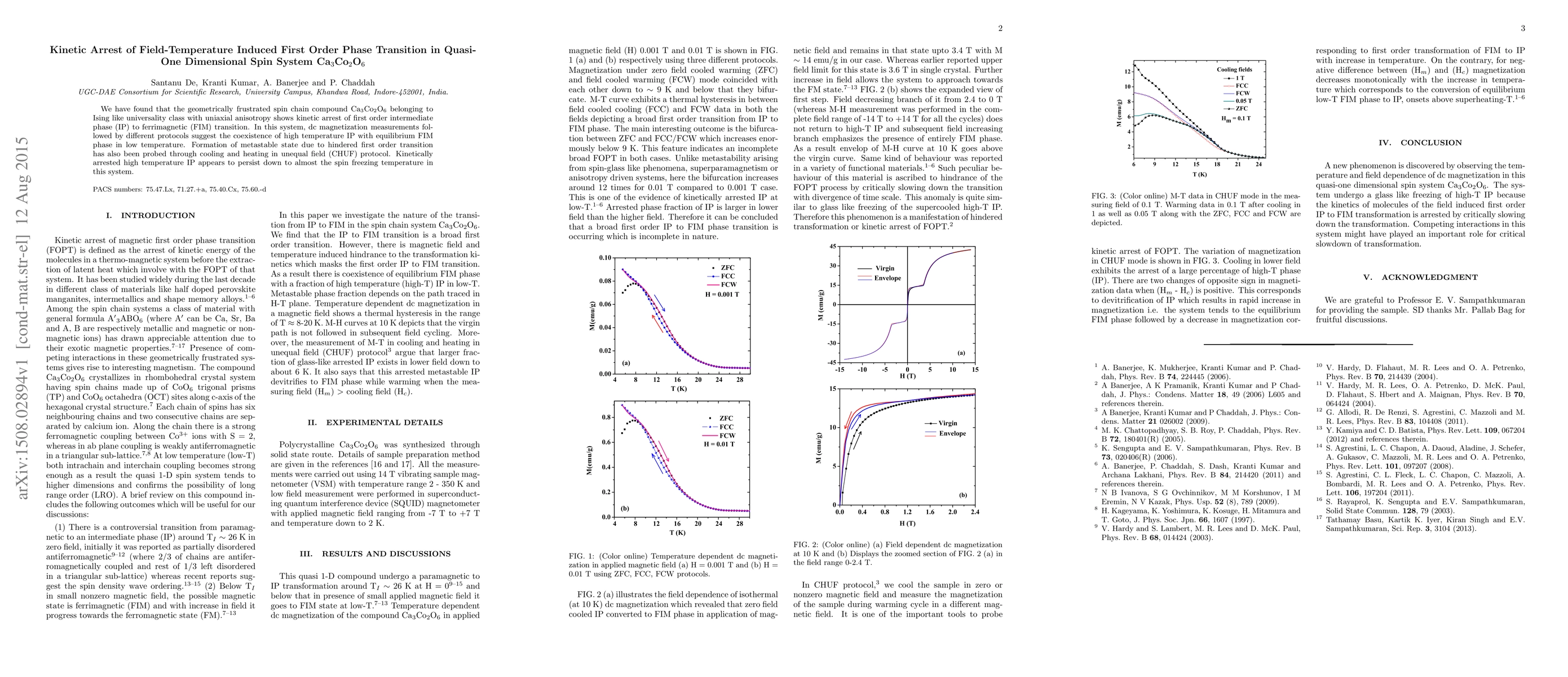We have found that the geometrically frustrated spin chain compound Ca3Co2O6 belonging to Ising like universality class with uniaxial anisotropy shows kinetic arrest of first order intermediate phase (IP) to ferrimagnetic (FIM) transition. In this system, dc magnetization measurements followed by different protocols suggest the coexistence of high temperature IP with equilibrium FIM phase in low temperature. Formation of metastable state due to hindered first order transition has also been probed through cooling and heating in unequal field (CHUF) protocol. Kinetically arrested high temperature IP appears to persist down to almost the spin freezing temperature in this system.