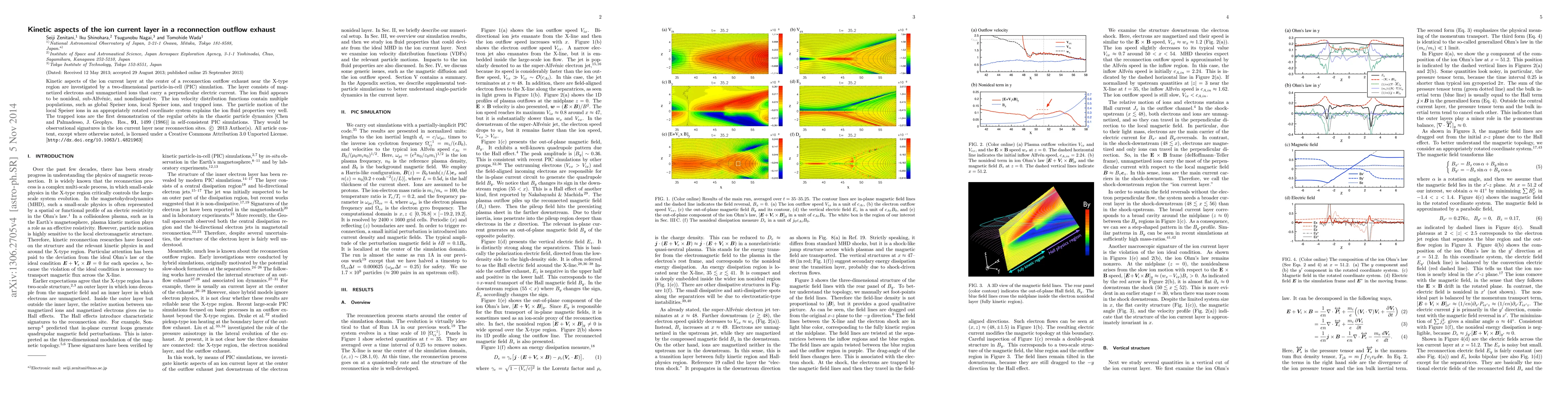 This paper investigates the kinetic behavior of the ion current layer in a reconnection outflow exhaust using 2D PIC simulations, revealing nonideal, sub-Alfvenic, and nondissipative ion fluid dynamics. The study identifies multiple ion populations, including trapped ions, which may serve as observational signatures near reconnection sites.