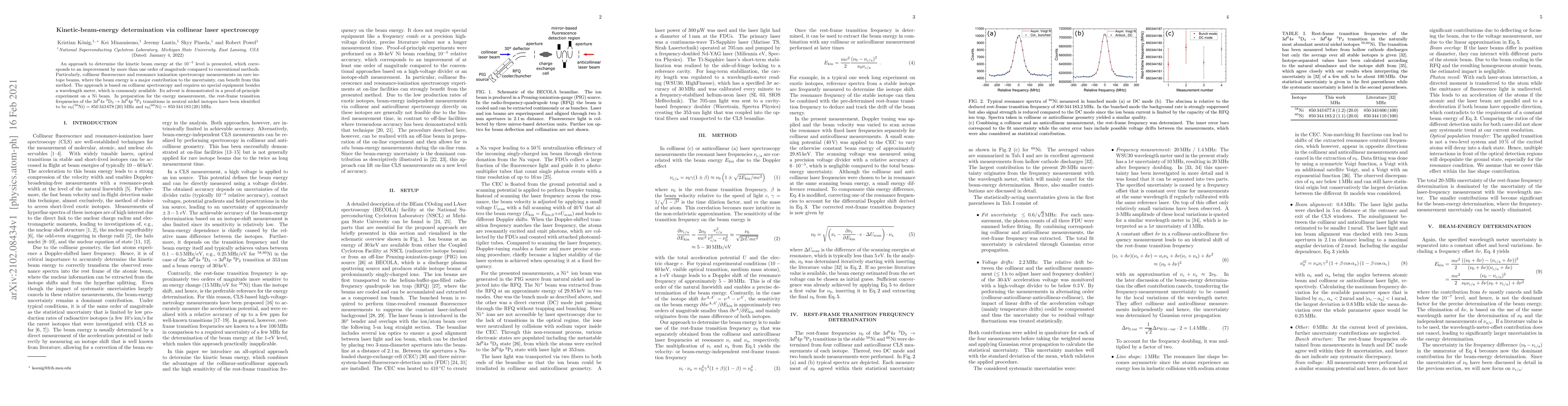An approach to determine the kinetic beam energy at the $10^{-5}$ level is presented, which corresponds to an improvement by more than one order of magnitude compared to conventional methods. Particularly, collinear fluorescence and resonance ionization spectroscopy measurements on rare isotope beams, where the beam energy is a major contribution to the uncertainty, can benefit from this method. The approach is based on collinear spectroscopy and requires no special equipment besides a wavelength meter, which is commonly available. Its advent is demonstrated in a proof-of-principle experiment on a Ni beam. In preparation for the energy measurement, the rest-frame transition frequencies of the $3d^9 4s\;^3\mathrm{D}_3 \rightarrow 3d^9 4p\;^3\mathrm{P}_2$ transitions in neutral nickel isotopes have been identified to be $\nu_0(^{58}\mathrm{Ni})=850\,343\,678\,(20)$ MHz and $\nu_0(^{60}\mathrm{Ni})=850\,344\,183\,(20)$ MHz.