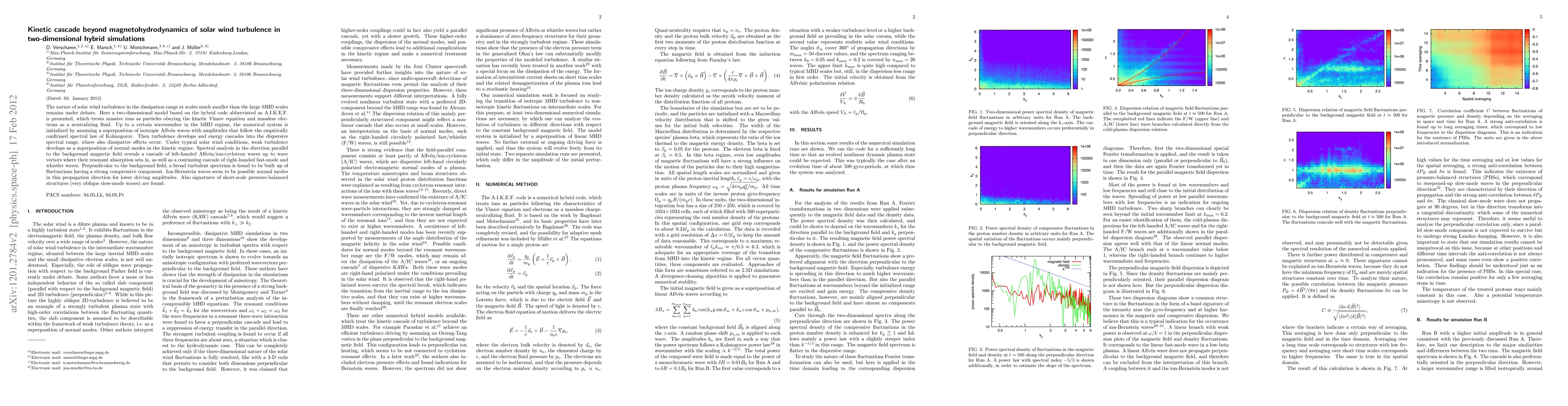 The nature of solar wind turbulence in the dissipation range at scales much smaller than the large MHD scales remains under debate. Here a two-dimensional model based on the hybrid code abbreviated as A.I.K.E.F. is presented, which treats massive ions as particles obeying the kinetic Vlasov equation and massless electrons as a neutralizing fluid. Up to a certain wavenumber in the MHD regime, the numerical system is initialized by assuming a superposition of isotropic Alfv\'en waves with amplitudes that follow the empirically confirmed spectral law of Kolmogorov. Then turbulence develops and energy cascades into the dispersive spectral range, where also dissipative effects occur. Under typical solar wind conditions, weak turbulence develops as a superposition of normal modes in the kinetic regime. Spectral analysis in the direction parallel to the background magnetic field reveals a cascade of left-handed Alfv\'en/ion-cyclotron waves up to wave vectors where their resonant absorption sets in, as well as a continuing cascade of right-handed fast-mode and whistler waves. Perpendicular to the background field, a broad turbulent spectrum is found to be built up of fluctuations having a strong compressive component. Ion-Bernstein waves seem to be possible normal modes in this propagation direction for lower driving amplitudes. Also signatures of short-scale pressure-balanced structures (very oblique slow-mode waves) are found.