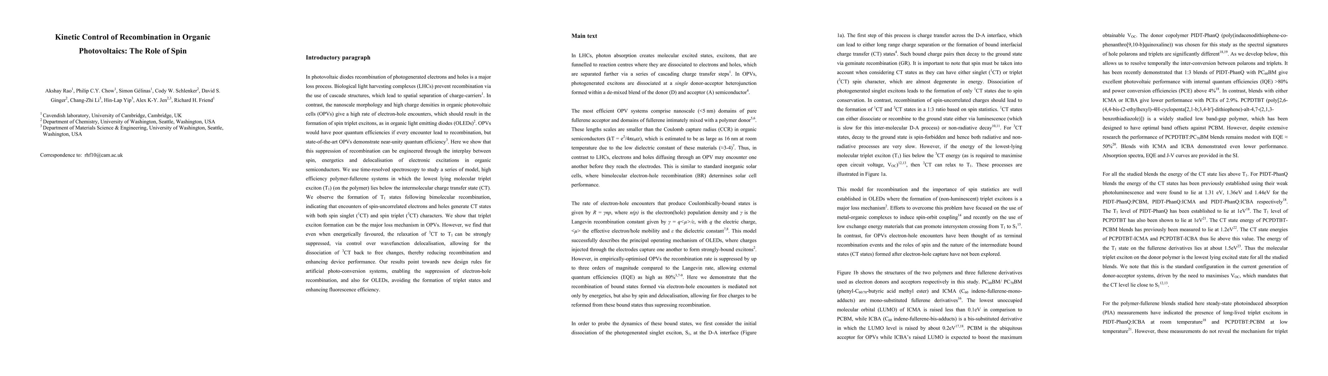 In photovoltaic diodes recombination of photogenerated electrons and holes is a major loss process. Biological light harvesting complexes (LHCs) prevent recombination via the use of cascade structures, which lead to spatial separation of charge-carriers1. In contrast, the nanoscale morphology and high charge densities in organic photovoltaic cells (OPVs) give a high rate of electron-hole encounters, which should result in the formation of spin triplet excitons, as in organic light emitting diodes (OLEDs)2. OPVs would have poor quantum efficiencies if every encounter lead to recombination, but state-of-the-art OPVs demonstrate near-unity quantum efficiency3. Here we show that this suppression of recombination can be engineered through the interplay between spin, energetics and delocalisation of electronic excitations in organic semiconductors. We use time-resolved spectroscopy to study a series of model, high efficiency polymer-fullerene systems in which the lowest lying molecular triplet exciton (T1) (on the polymer) lies below the intermolecular charge transfer state (CT). We observe the formation of T1 states following bimolecular recombination, indicating that encounters of spin-uncorrelated electrons and holes generate CT states with both spin singlet (1CT) and spin triplet (3CT) characters. We show that triplet exciton formation can be the major loss mechanism in OPVs. However, we find that even when energetically favoured, the relaxation of 3CT to T1 can be strongly suppressed, via control over wavefunction delocalisation, allowing for the dissociation of 3CT back to free changes, thereby reducing recombination and enhancing device performance. Our results point towards new design rules for artificial photo-conversion systems, enabling the suppression of electron-hole recombination, and also for OLEDs, avoiding the formation of triplet states and enhancing fluorescence efficiency.