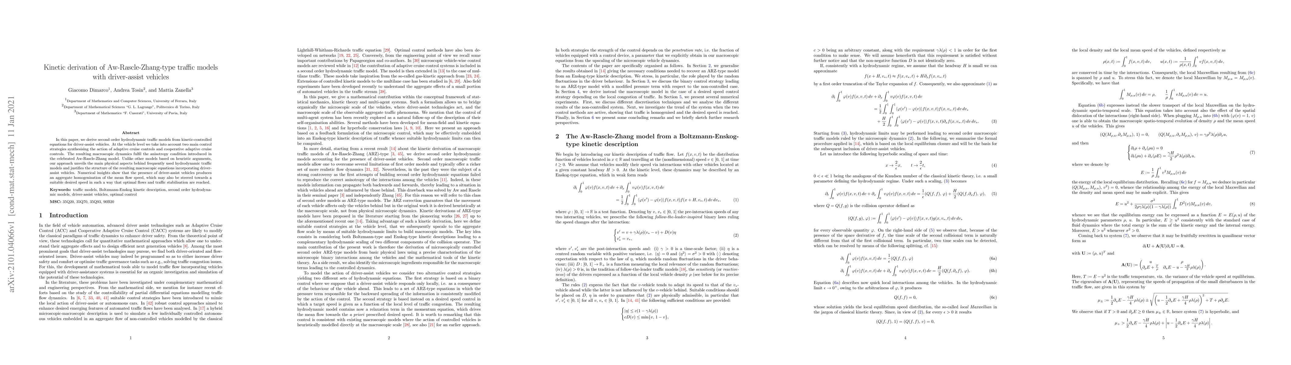 This paper derives second-order hydrodynamic traffic models from kinetic-controlled equations for driver-assist vehicles, incorporating adaptive and cooperative cruise control strategies. The resulting macroscopic dynamics meet the anisotropy condition of the Aw-Rascle-Zhang model, providing a physical justification for the model's structure and demonstrating optimal flow and traffic stabilization through aggregate speed homogenization.
