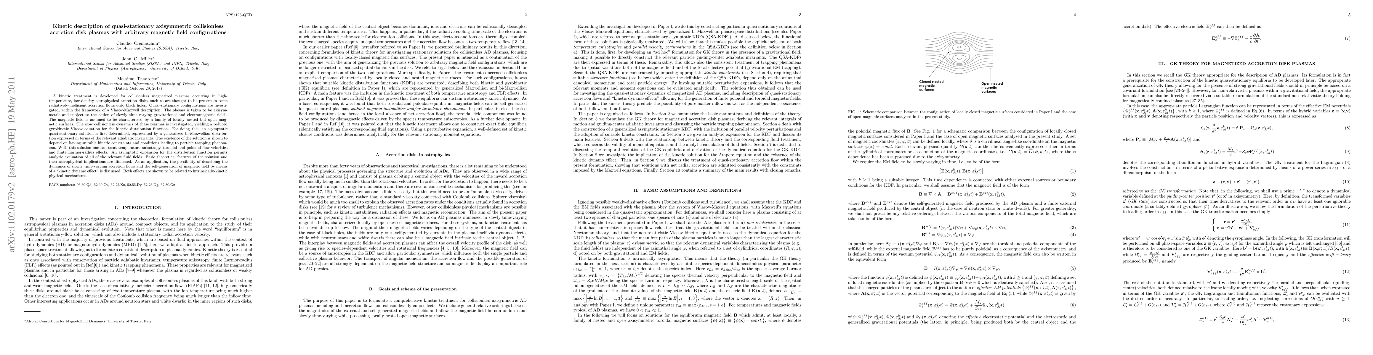 A kinetic treatment is developed for collisionless magnetized plasmas occurring in high-temperature, low-density astrophysical accretion disks, such as are thought to be present in some radiatively-inefficient accretion flows onto black holes. Quasi-stationary configurations are investigated, within the framework of a Vlasov-Maxwell description. The plasma is taken to be axisymmetric and subject to the action of slowly time-varying gravitational and electromagnetic fields. The magnetic field is assumed to be characterized by a family of locally nested but open magnetic surfaces. The slow collisionless dynamics of these plasmas is investigated, yielding a reduced gyrokinetic Vlasov equation for the kinetic distribution function. For doing this, an asymptotic quasi-stationary solution is first determined, represented by a generalized bi-Maxwellian distribution expressed in terms of the relevant adiabatic invariants. The existence of the solution is shown to depend on having suitable kinetic constraints and conditions leading to particle trapping phenomena. With this solution one can treat temperature anisotropy, toroidal and poloidal flow velocities and finite Larmor-radius effects. An asymptotic expansion for the distribution function permits analytic evaluation of all of the relevant fluid fields. Basic theoretical features of the solution and their astrophysical implications are discussed. As an application, the possibility of describing the dynamics of slowly time-varying accretion flows and the self-generation of magnetic field by means of a \textquotedblleft kinetic dynamo effect\textquotedblright\ is discussed. Both effects are shown to be related to intrinsically-kinetic physical mechanisms.
