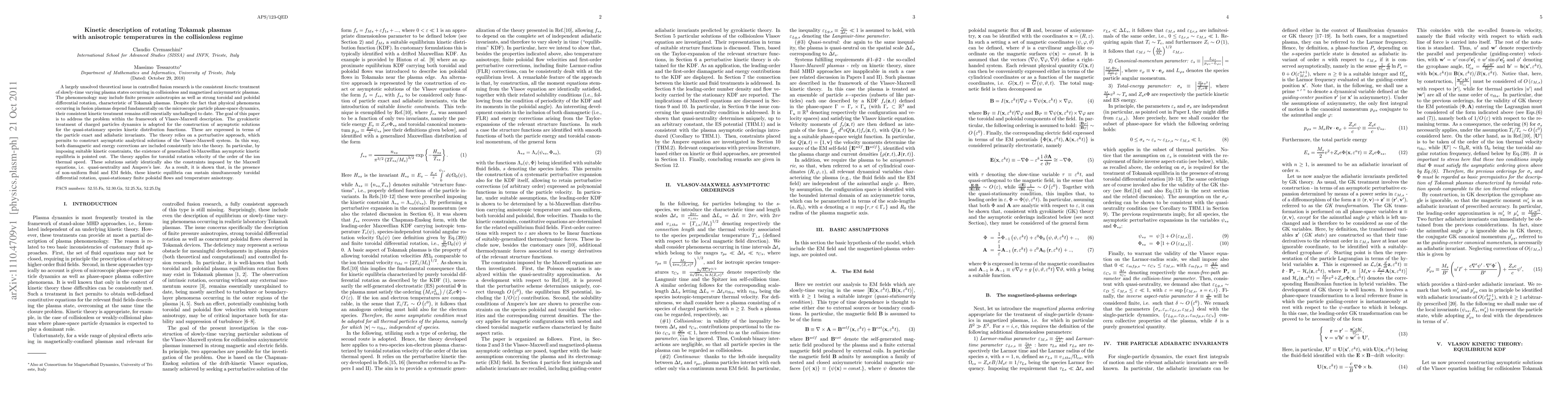 This paper develops a kinetic theory for slowly-time varying plasma states in Tokamak fusion devices, focusing on anisotropic temperatures and differential rotation in the collisionless regime. The Vlasov-Maxwell framework and gyrokinetic treatment yield asymptotic solutions for quasi-stationary kinetic distribution functions, revealing generalized bi-Maxwellian equilibria that sustain toroidal rotation, poloidal flows, and temperature anisotropy.