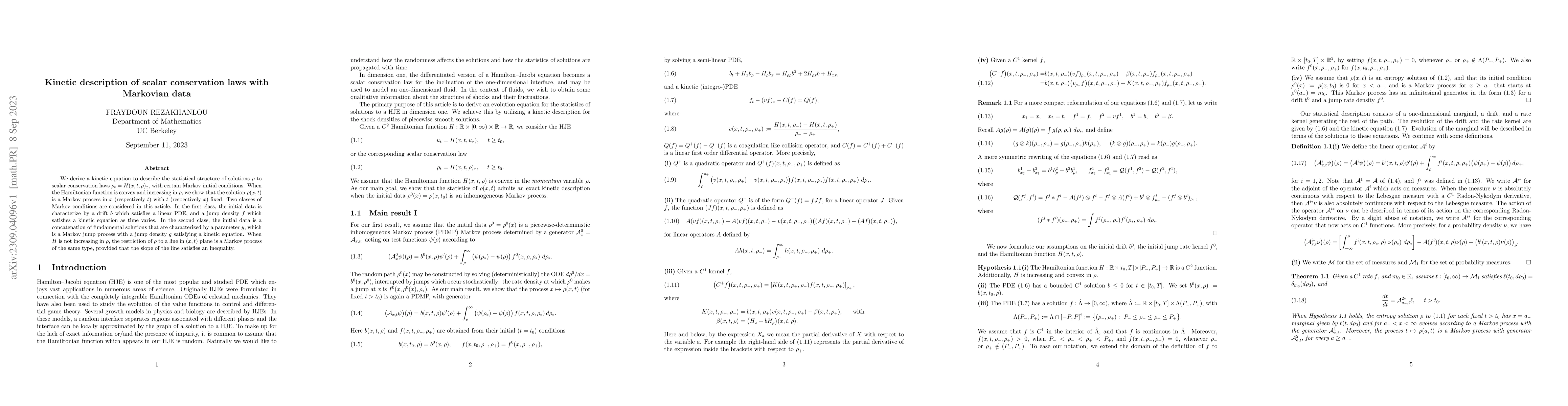 This paper derives a kinetic equation to describe the statistical structure of solutions to scalar conservation laws under Markovian initial conditions. It shows that when the Hamiltonian is convex and increasing in the solution, the solution itself is a Markov process, with two classes of Markov conditions explored in detail.