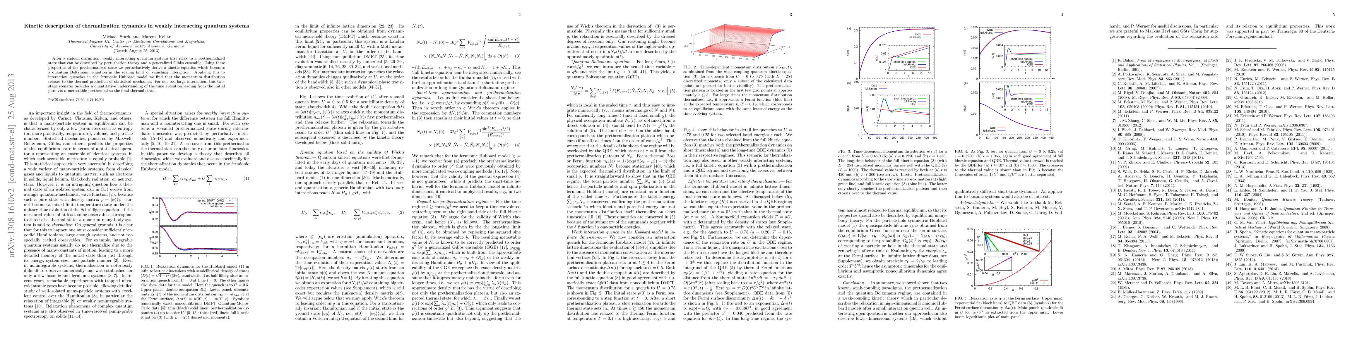 This paper develops a kinetic description of thermalization in weakly interacting quantum systems, deriving a quantum Boltzmann equation from a prethermalized state. It applies this framework to the fermionic Hubbard model, showing that the momentum distribution evolves towards thermal predictions, providing a quantitative understanding of the transition from initial to final thermal states.