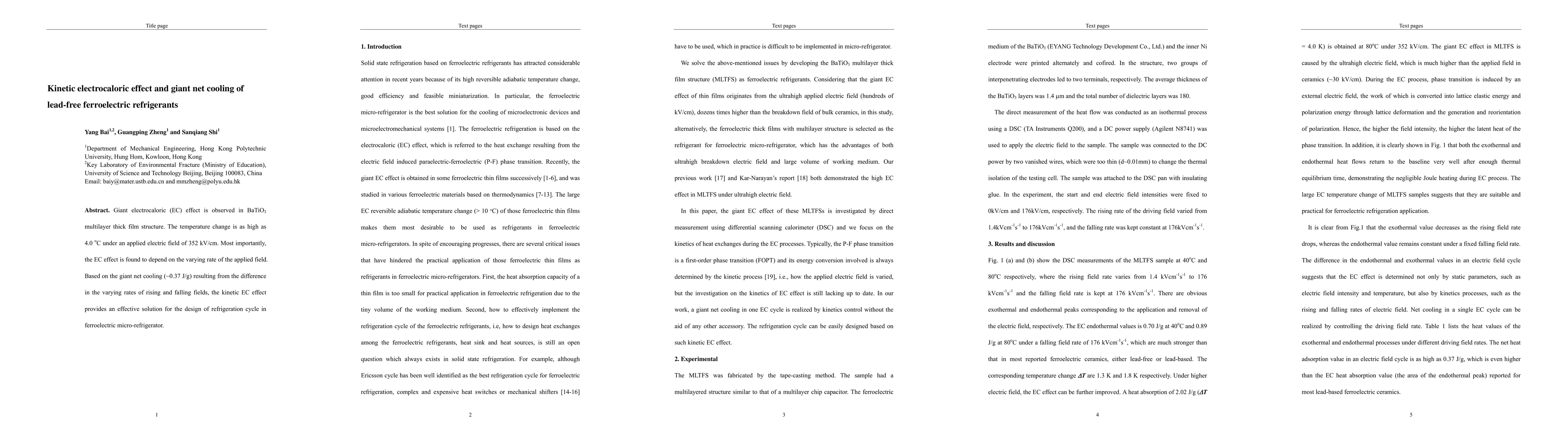 This study demonstrates a giant electrocaloric effect in BaTiO3 multilayer films, achieving a temperature change of 4.0°C under an electric field of 352 kV/cm. The kinetic electrocaloric effect, dependent on the rate of the applied field, results in significant net cooling (~0.37 J/g), offering a promising approach for lead-free ferroelectric refrigeration.
