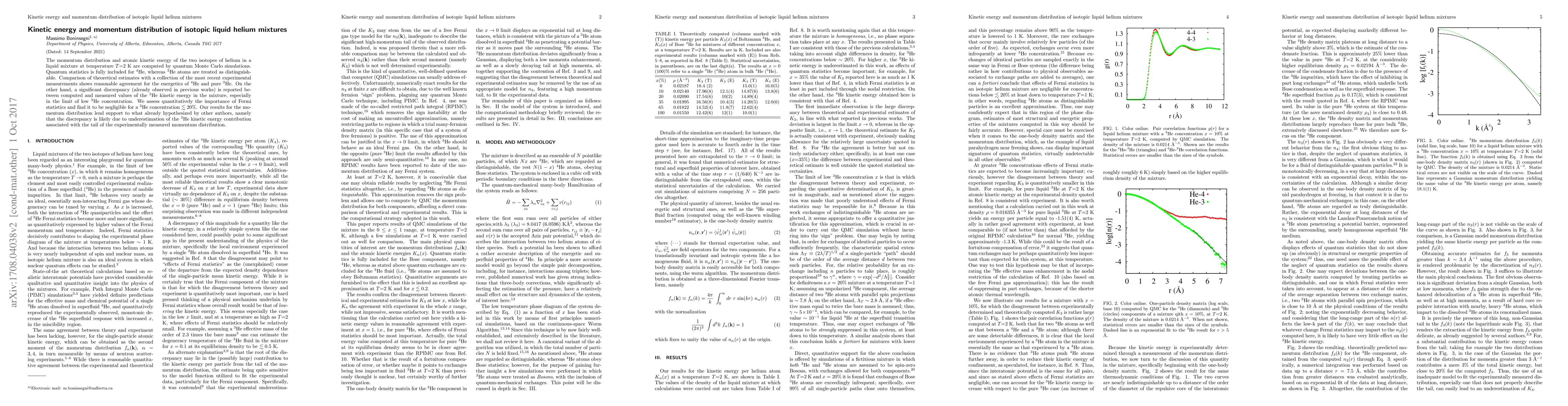 The momentum distribution and atomic kinetic energy of the two isotopes of helium in a liquid mixture at temperature T=2 K are computed by quantum Monte Carlo simulations. Quantum statistics is fully included for He-4, whereas He-3 atoms are treated as distinguishable. Comparison of theoretical estimates with a collection of the most recent experimental measurements shows reasonable agreement for the energetics of He-4 and pure He-3. On the other hand, a significant discrepancy (already observed in previous works) is reported between computed and measured values of the He-3 kinetic energy in the mixture, in the limit of low He-3 concentration. We assess quantitatively the importance of Fermi statistics and find it to be negligible for a He-3 concentration less than approximately 20%. Our results for the momentum distributions lend support to what already hypothesized by other authors, namely that the discrepancy is likely due to underestimation of the He-3 kinetic energy contribution associated with the tail of the experimentally measured momentum distribution.