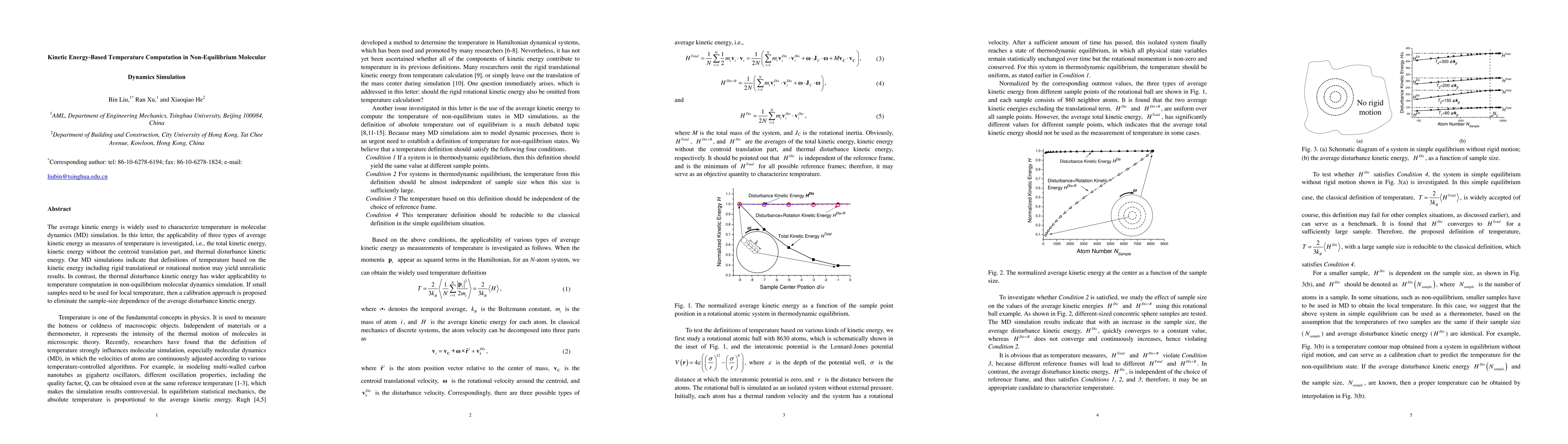 The average kinetic energy is widely used to characterize temperature in molecular dynamics (MD) simulation. In this letter, the applicability of three types of average kinetic energy as measures of temperature is investigated, i.e., the total kinetic energy, kinetic energy without the centroid translation part, and thermal disturbance kinetic energy. Our MD simulations indicate that definitions of temperature based on the kinetic energy including rigid translational or rotational motion may yield unrealistic results. In contrast, the thermal disturbance kinetic energy has wider applicability to temperature computation in non-equilibrium molecular dynamics simulation. If small samples need to be used for local temperature, then a calibration approach is proposed to eliminate the sample-size dependence of the average disturbance kinetic energy.