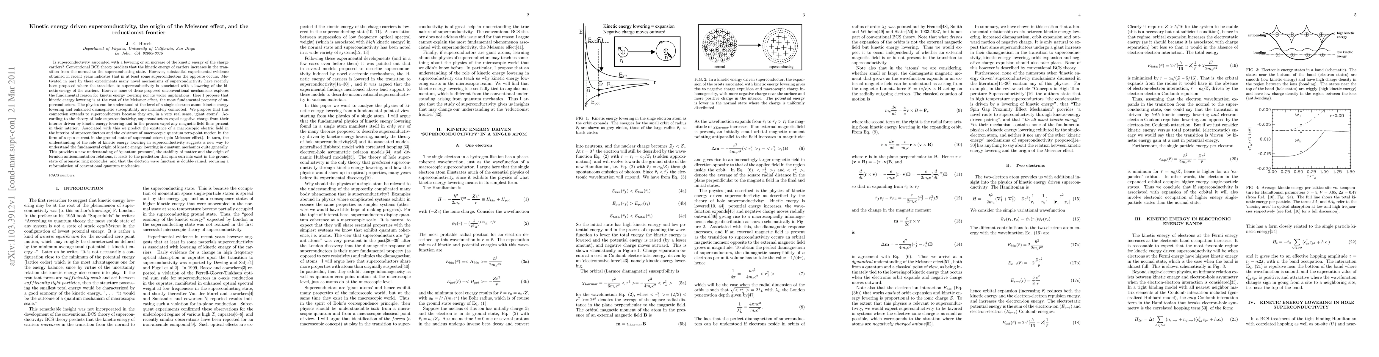 This paper proposes that kinetic energy lowering of charge carriers underpins the Meissner effect in superconductors, challenging conventional BCS theory. It suggests that kinetic energy reduction drives the expulsion of magnetic fields, leading to the prediction of macroscopic electric fields and spin currents in superconductors.