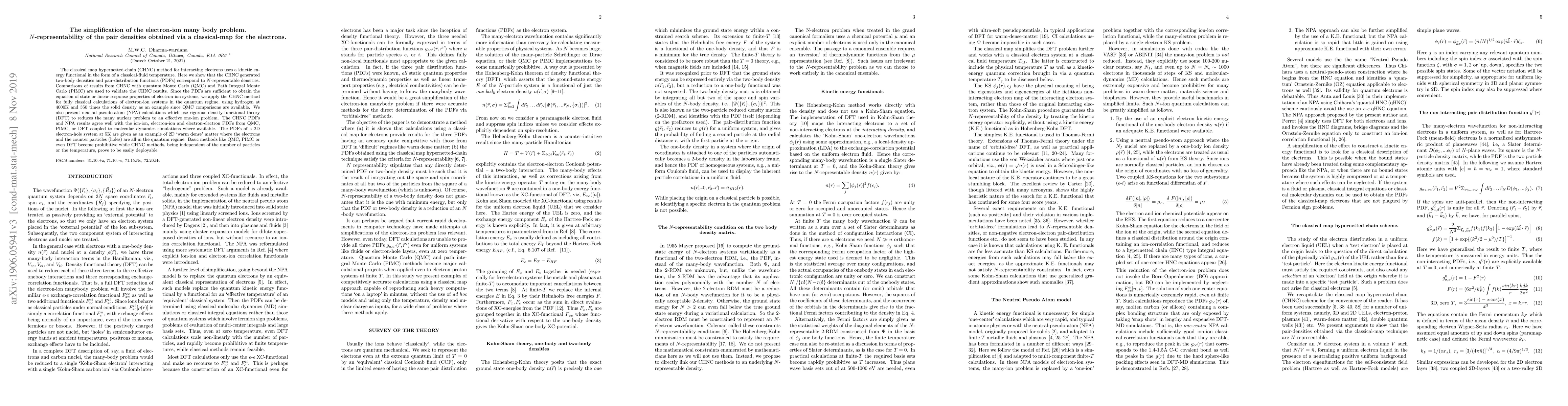 The classical map hypernetted-chain (CHNC) method for interacting electrons uses a kinetic energy functional in the form of a classical-fluid temperature. Here we show that the CHNC generated two-body densities and pair-distribution functions (PDFs) correspond to $N$-representable densities. Comparisons of results from CHNC with quantum Monte Carlo (QMC) and Path Integral Monte Carlo (PIMC) are used to validate the CHNC results. Since the PDFs are sufficient to obtain the equation of state or linear-response properties of electron-ion systems, we apply the CHNC method for fully classical calculations of electron-ion systems in the quantum regime, using hydrogen at 4000K and 350 times the solid density as an example since QMC comparisons are available. We also present neutral pseudo-atom (NPA) calculations which use rigorous density-functional theory (DFT) to reduces the many nuclear problem to an effective one-ion problem. The CHNC PDFs and NPA results agree well with the ion-ion, electron-ion and electron-electron PDFs from QMC, PIMC, or DFT coupled to molecular dynamics simulations where available. The PDFs of a 2D electron-hole system at 5K are given as an example of 2D `warm dense' matter where the electrons and the counter particles (holes) are all in the quantum regime. Basic methods like QMC, PIMC or even DFT become prohibitive while CHNC methods, being independent of the number of particles or the temperature, prove to be easily deployable.