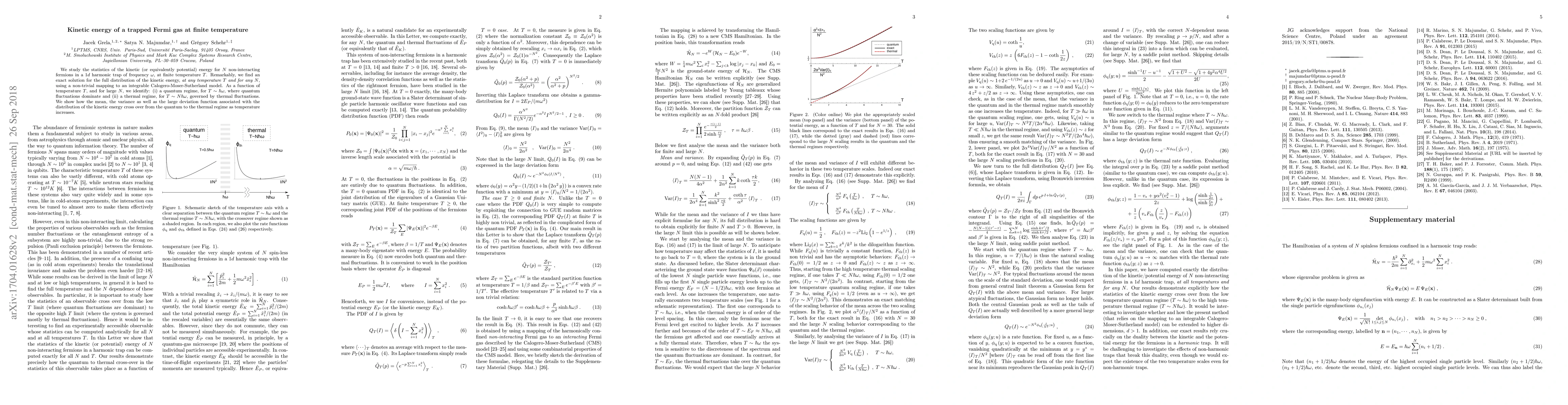We study the statistics of the kinetic (or equivalently potential) energy for $N$ non-interacting fermions in a $1d$ harmonic trap of frequency $\omega$, at finite temperature $T$. Remarkably, we find an exact solution for the full distribution of the kinetic energy, at any temperature $T$ and for any $N$, using a non-trivial mapping to an integrable Calogero-Moser-Sutherland model. As a function of temperature $T$, and for large $N$, we identify: (i) a quantum regime, for $T \sim \hbar \omega$, where quantum fluctuations dominate and (ii) a thermal regime, for $T \sim N \hbar \omega$, governed by thermal fluctuations. We show how the mean, the variance as well as the large deviation function associated with the distribution of the kinetic energy cross over from the quantum to the thermal regime as temperature increases.