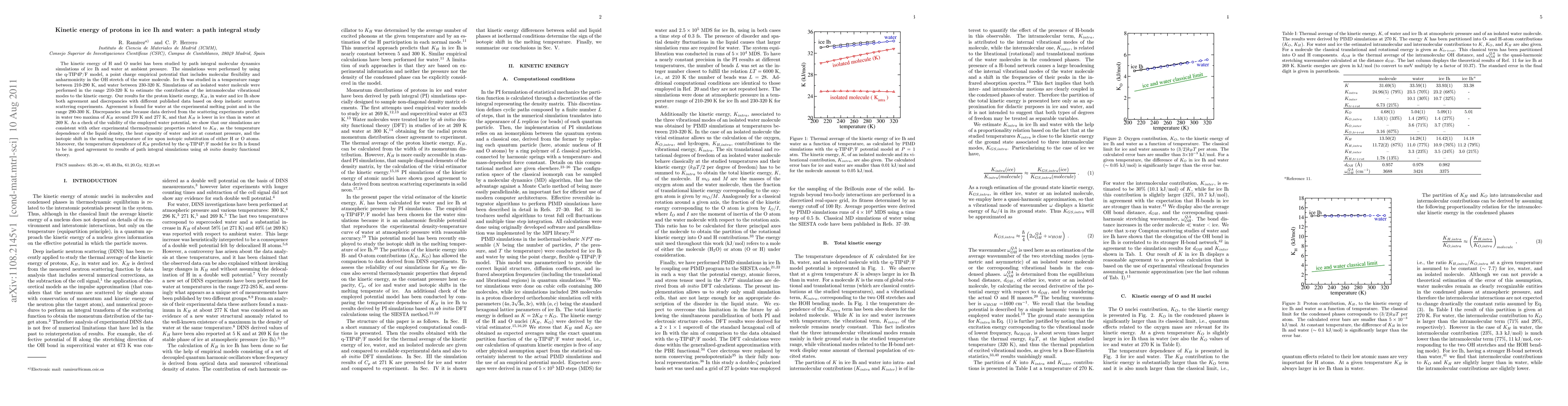 This study uses path integral molecular dynamics simulations to investigate the kinetic energy of protons in ice Ih and water, finding agreement with experimental data for water's proton kinetic energy at certain temperatures but discrepancies with neutron scattering predictions, which suggest higher proton kinetic energy in water compared to ice. The simulations are validated by consistency with other thermodynamic properties.