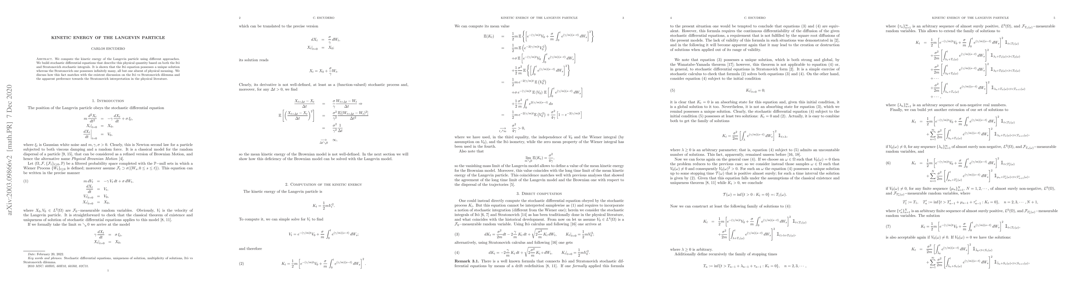 We compute the kinetic energy of the Langevin particle using different approaches. We build stochastic differential equations that describe this physical quantity based on both the It\^o and Stratonovich stochastic integrals. It is shown that the It\^o equation possesses a unique solution whereas the Stratonovich one possesses infinitely many, all but one absent of physical meaning. We discuss how this fact matches with the existent discussion on the It\^o vs Stratonovich dilemma and the apparent preference towards the Stratonovich interpretation in the physical literature.