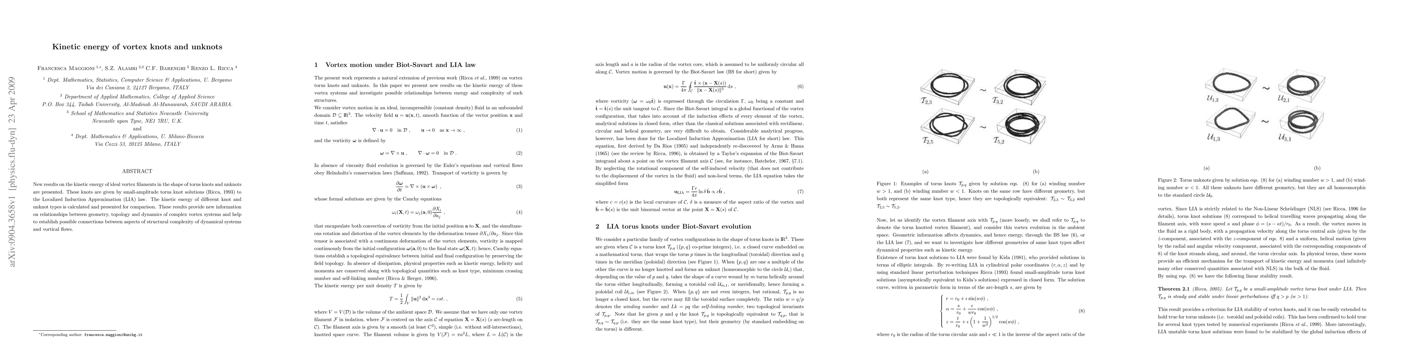 This paper presents new findings on the kinetic energy of vortex filaments shaped as torus knots and unknots, calculated using the Localized Induction Approximation. The study compares different knot types and reveals insights into the relationships between geometry, topology, and dynamics in complex vortex systems.