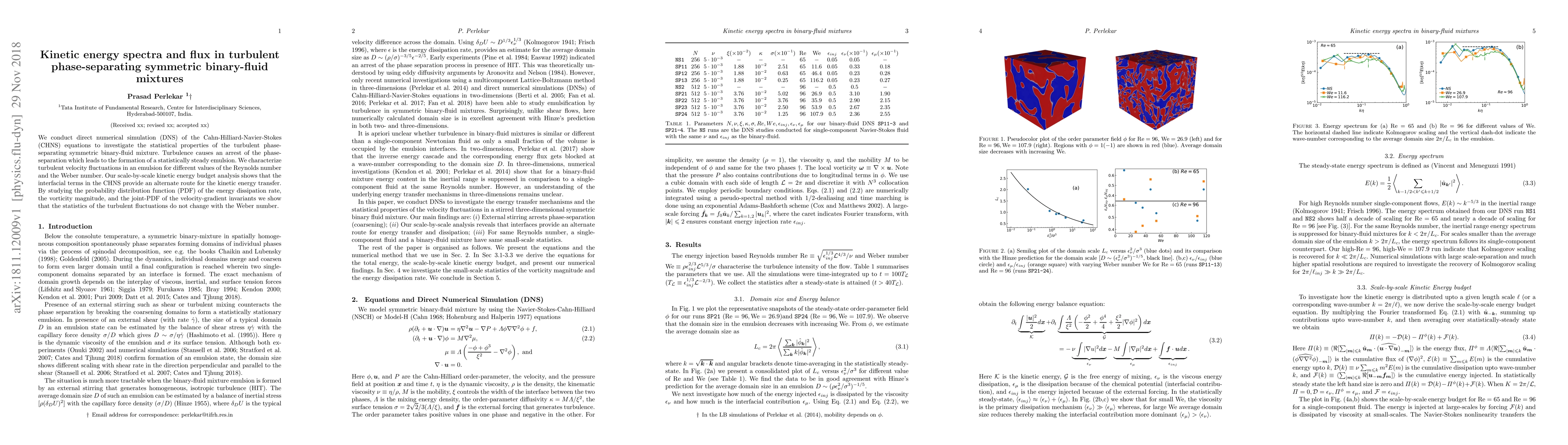 We conduct direct numerical simulation (DNS) of the Cahn-Hilliard-Navier-Stokes (CHNS) equations to investigate the statistical properties of the turbulent phase-separating symmetric binary-fluid mixture. Turbulence causes an arrest of the phase-separation which leads to the formation of a statistically steady emulsion. We characterize turbulent velocity fluctuations in an emulsion for different values of the Reynolds number and the Weber number. Our scale-by-scale kinetic energy budget analysis shows that the interfacial terms in the CHNS provide an alternate route for the kinetic energy transfer. By studying the probability distribution function (PDF) of the energy dissipation rate, the vorticity magnitude, and the joint-PDF of the velocity-gradient invariants we show that the statistics of the turbulent fluctuations do not change with the Weber number.